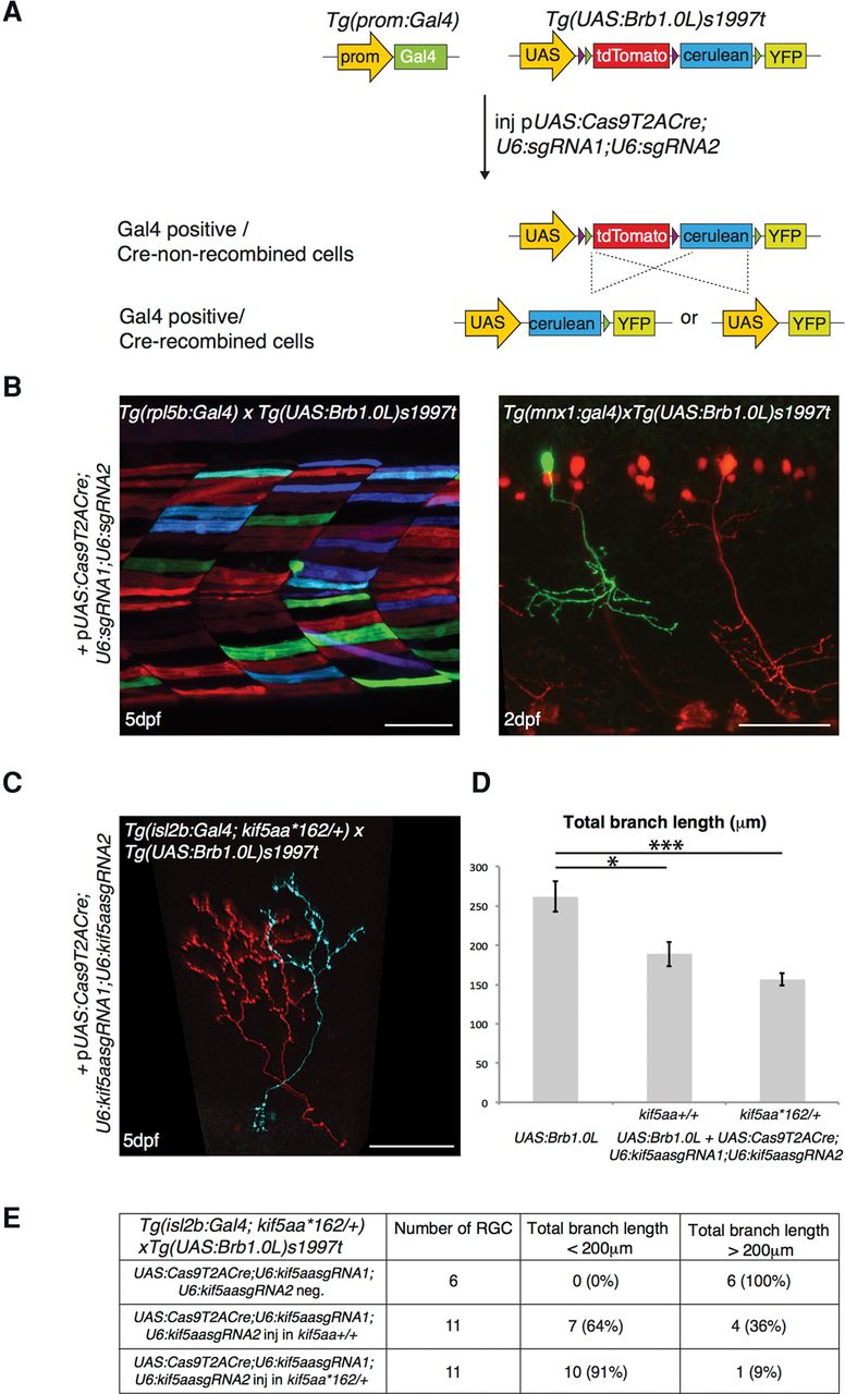 Labeling of mutant single cells by combining the 2C-Cas9 and the Brainbow methodologies. (A) Microinjection of the pUAS:Cas9T2ACre;U6sgRNA1;U6sgRNA2 construct in the double transgenic embryos Tg(promoter:Gal4) × Tg(UAS:Brb1.0L)s1997t leads to synthesis of both Cas9 and Cre. In Gal4-expressing cells, Cas9 promotes targeted cleavage of the chosen genomic locus. At the same time, Cre activity induces stochastic recombination of the UAS:Brb1.0L cassette, thus promoting a switch from the default tdTomato to YFP or Cerulean fluorescence in the same cells. (B) Recombination of the UAS:Brb1.0L cassette in a tissue-specific pattern induced by injection of the pUAS:Cas9T2ACre;U6sgRNA1;U6sgRNA2 plasmid. No target sequence was inserted in the vector prior to injection. (Left panel) Multicolor labeling of muscle cells in the Tg(rpl5b:Gal4) transgenic line. (Right panel) Single YFP motor neuron labeled by expression of UAS:Cas9T2ACre;U6sgRNA1;U6sgRNA2 transgene in the double transgenic embryos Tg(mnx1:Gal4) × Tg(UAS:Brb1.0L)s1997t. tdTomato marks motor neurons that do not express the UAS transgenic cassette. Scale bar = 50 µm. (C) Double transgenic Tg(isl2b:Gal4; kif5aa*162/+-) × Tg(UAS:Brb1.0L)s1997t larva, injected with pUAS:Cas9T2ACre;U6:Kif5aasgRNA1;U6:Kif5aasgRNA2. isl2b:Gal4 drives the expression of UAS:Brb1.0L transgene in RGC axons in the optic tectum. Note that the axon marked by cerulean expression, and therefore by Cre recombinase activity, shows reduced arbor size as expected from the phenotype of kif5aa−/− RGCs transplanted in wild-type host (Auer et al. 2015). Scale bar = 30 µm. (D) Quantification of total branch length in tdTomato-positive wild-type and potentially mutant Cerulean- or YFP-positive RGC axons (analyzed in kif5aa+/+: [*] P-value < 0.05 following Wilcoxon Mann–Whitney test, and kif5aa*162/+: [***] P-value < 0.001 following Wilcoxon Mann–Whitney test). Data are represented as mean ± SEM. (E) Table describing the percentage of RGCs displaying a wild-type-like (axonal length > 200 µm) and a mutant-like (axonal length < 200 µm) phenotype in the tectum of double transgenic Tg(isl2b:Gal4; kif5aa*162/+-) × Tg(UAS:Brb1.0L)s1997t larva, injected with pUAS:Cas9T2ACre;U6:Kif5aasgRNA1;U6:Kif5aasgRNA2. (First row) tdTomato-positive cells (UAS:Cas9T2ACre;U6:Kif5aasgRNA1;U6:Kif5aasgRNA2-negative). (Second row) Cerulean- or YFP-positive neurons (UAS:Cas9T2ACre;U6:Kif5aasgRNA1;U6:Kif5aasgRNA2-positive) in kif5aa+/+fish. (Third row) Cerulean- or YFP-positive neurons (UAS:Cas9T2ACre;U6:Kif5aasgRNA1;U6:Kif5aasgRNA2-positive) in kif5aa*162/+fish.