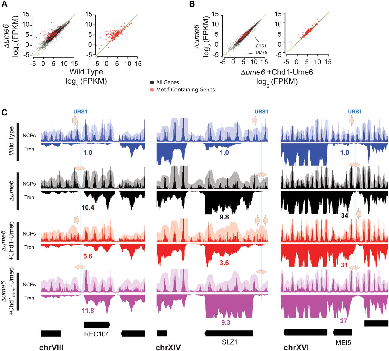 Nucleosome positioning by Chd1-Ume6 is mildly repressive. (A) Differences in transcription between the wild type and Δume6 at all genes (black) or at genes with a WNGGCGGCWW motif within 500 bp of the open reading frame (red). Transcript abundance was calculated using Cufflinks (Trapnell et al. 2012). (FPKM) Fragments per kilobase of transcript per million fragments mapped. Green diagonal indicates the y = x axis. Points above the diagonal are repressed in wild-type cells. (B) Differences in transcription (log2 FPKM) in Δume6 cells with or without addition of Chd1-Ume6 at all genes (black) or genes with associated WNGGCGGCWW motifs (red). Green diagonal indicates the y = x axis. Points above the diagonal are repressed upon introduction of Chd1-Ume6. (C) Example loci showing nucleosome positioning (upper panels), RNA signal (lower panels), and relative transcript abundance from RNA-seq data (associated numbers) at indicated genes for the wild-type, Δume6, and Δume6 + [Chd1-Ume6] and Δume6 + [Chd1D513N-Ume6] strains. Blue lines represent associated Ume6 recognition motifs, and arrows denote directional closing (single-headed arrow) or opening (double-headed arrow) of associated NDRs.