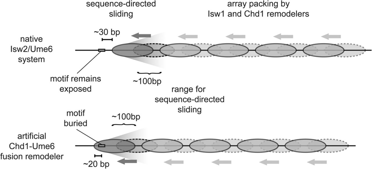 Model for transcription factor-mediated chromatin remodeling at sequence-targeted sites. (Top) In the endogenous system, Isw2 is recruited to specific genomic loci through interaction with Ume6 at target motifs (rectangle). Motif-proximal nucleosomes (dark gray) within a limited range are shifted by Isw2 from an unremodeled position (dashed lines) to a final position such that 30 bp of DNA are exposed between the motif center and the nucleosome edge. (Bottom) The artificial Chd1-Ume6 system works through a similar mechanism where the motif proximal nucleosome is directly moved by the chromatin remodeling protein, but with this remodeler, the recruitment motif is buried by 20 bp of nucleosomal DNA. For both cases of sequence-directed nucleosome sliding, the motif-proximal nucleosome determines the phasing for evenly spaced nucleosome arrays that are packed against these founding nucleosomes by endogenous remodelers.