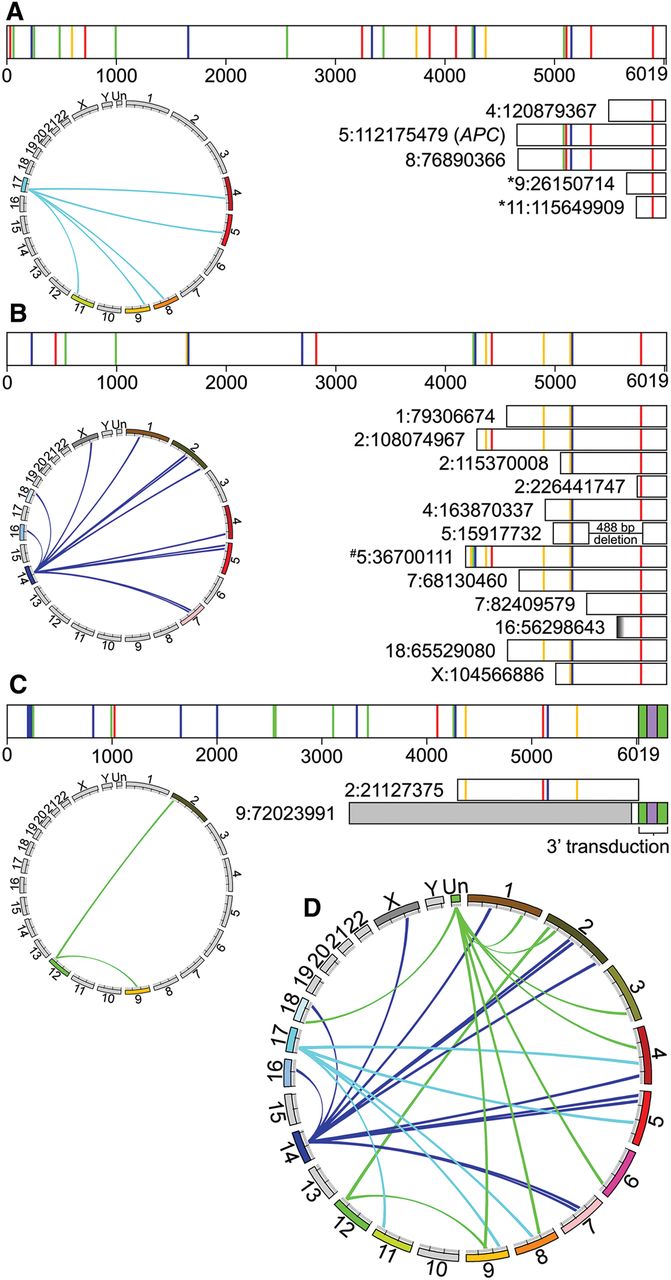 Source elements that gave rise to somatic L1 insertions in the tumor. As in Figure 2, the bar diagrams in A–C depict mutations in the L1 sequences of source elements and somatic offspring relative to the reference element L1.3. Colored vertical lines represent single nucleotide mutations as outlined in Figure 2. The Circos plots show the somatic offspring L1 insertions that were generated by each FL-L1Hs source element. (A) The Chr 17 source element gave rise to five somatic insertions, including the insertion in APC. The mutation profile of the APC insertion uniquely and perfectly matches that of the Chr 17 FL-L1Hs source element to the extent that the APC insertion spans the 3′ region of the Chr 17 source element. Two of the Chr 17 somatic offspring (denoted by *) had extreme 5′ truncations and thus only had one mutation (C5788T) compared to L1.3. Although the mutation profiles of these offspring do not exclusively match that of the Chr 17 source element, the one remaining possible source element for these somatic offspring (ID 1:86392759) was ruled out due to lack of intact ORFs. (B) The Chr 14 source element gave rise to 12 somatic insertions. The mutation profiles for 11 of 12 (91.7%) of these offspring uniquely and perfectly match the mutation profile of the Chr 14 source element. The remaining somatic offspring (denoted by #) had one additional mutation (T4250G) that was not present in the Chr 14 source element. This mutation does not match any other source element and most likely was introduced during retrotransposition (which is error prone) (Gilbert et al. 2005). The blurry end of somatic offspring 16:56298643 represents ambiguity of the 5′ end because we did not sequence that end. (C) The Chr 12 source element gave rise to two somatic insertions. One was assigned to the Chr 12 source element using mutation profiles as outlined for the Chr 17 and Chr 14 source elements above, whereas the other was assigned using a 3′ transduction (purple box flanked by poly(A) tails in green) (Moran et al. 1999). (D) Circos plot depicting all 27 somatic insertions discovered in this tumor, including the somatic offspring with known source elements depicted above (A–C) and eight additional somatic offspring from an unknown source element: (green) unknown chromosome (Un).