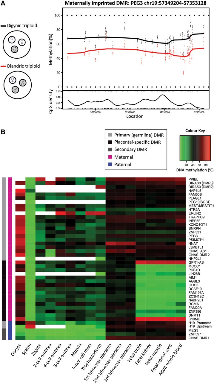 Characterization of known imprinted DMRs in human development. (A) Digynic triploid conceptions contain two maternal (white) and one paternal (gray) genome, while diandric triploid conceptions contain one maternal and two paternal genomes. By comparing digynic (N = 5) and diandric (N = 5) triploid placental villi, DMRs were identified, defined as ≥3 CpGs within 500 bp. An example plot shows a maternal DMR near PEG3, which is more highly methylated among digynic triploid samples (black line), compared to diandric triploid samples (red line) across 37 CpG sites over a ∼4-kb region. (B) DNA methylation through early human development is shown for 43 DMRs, identified between triploid samples that overlap previously reported imprinted DMRs (Court et al. 2014). DNA methylation for human germ cells, early embryonic stages (zygote, two-cell, four-cell, eight-cell, and morula stage embryos), inner cell mass, and trophectoderm is an average of CpG sites across each DMR measured by RRBS. DNA methylation for placental villi, fetal tissues (brain, kidney, muscle, and spinal cord), and whole blood was an average of 450K array probes across each DMR. Primary (germline) imprinted DMRs (light gray), placental-specific DMRs (black), and secondary DMRs (dark gray) are denoted. Parental origin of DNA methylation is designated as maternal (magenta) or paternal (blue). White boxes in the heat map indicate DMRs with no data.