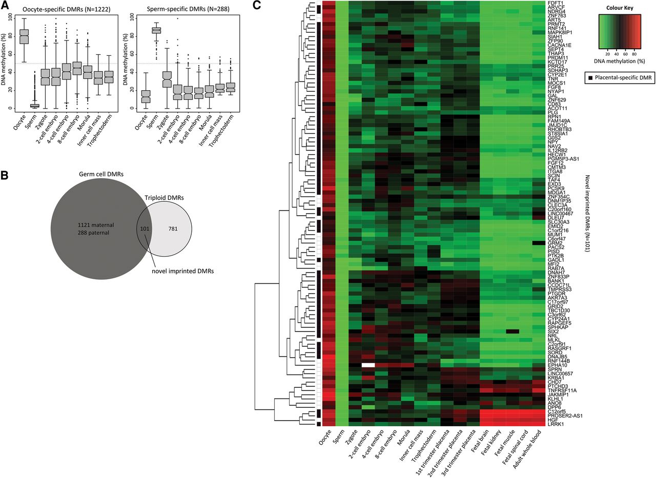 Identification of novel imprinted placental DMRs. (A) DNA methylation is shown for oocyte-specific (left panel) and sperm-specific (right panel) DMRs in human gametes and early embryonic stages (zygote, two-cell, four-cell, eight-cell, and morula stage embryos), ICM, and TE. DMRs were defined as CGIs that showed a >50% methylation difference between gametes, with intermediate methylation (15%–60%) in the ICM and TE. (B) The number of DMRs that overlap between those identified between human gametes and those identified between triploid placental samples is shown. (C) DNA methylation through early human development is shown for the 101 novel imprinted DMRs. DNA methylation for human gametes, early embryonic stages (zygote, two-cell, four-cell, eight-cell, and morula stage embryos), ICM, and TE is an average of CpG sites across each DMR, measured by RRBS. DNA methylation for placental villi, fetal tissues (brain, kidney, muscle, and spinal cord), and whole blood was an average of 450K array probes across each DMR. Seventy-two novel DMRs showed a placental-specific pattern of imprinting, defined as <25% or >75% methylation in somatic tissues and intermediately (25%–75%) methylated in placenta.