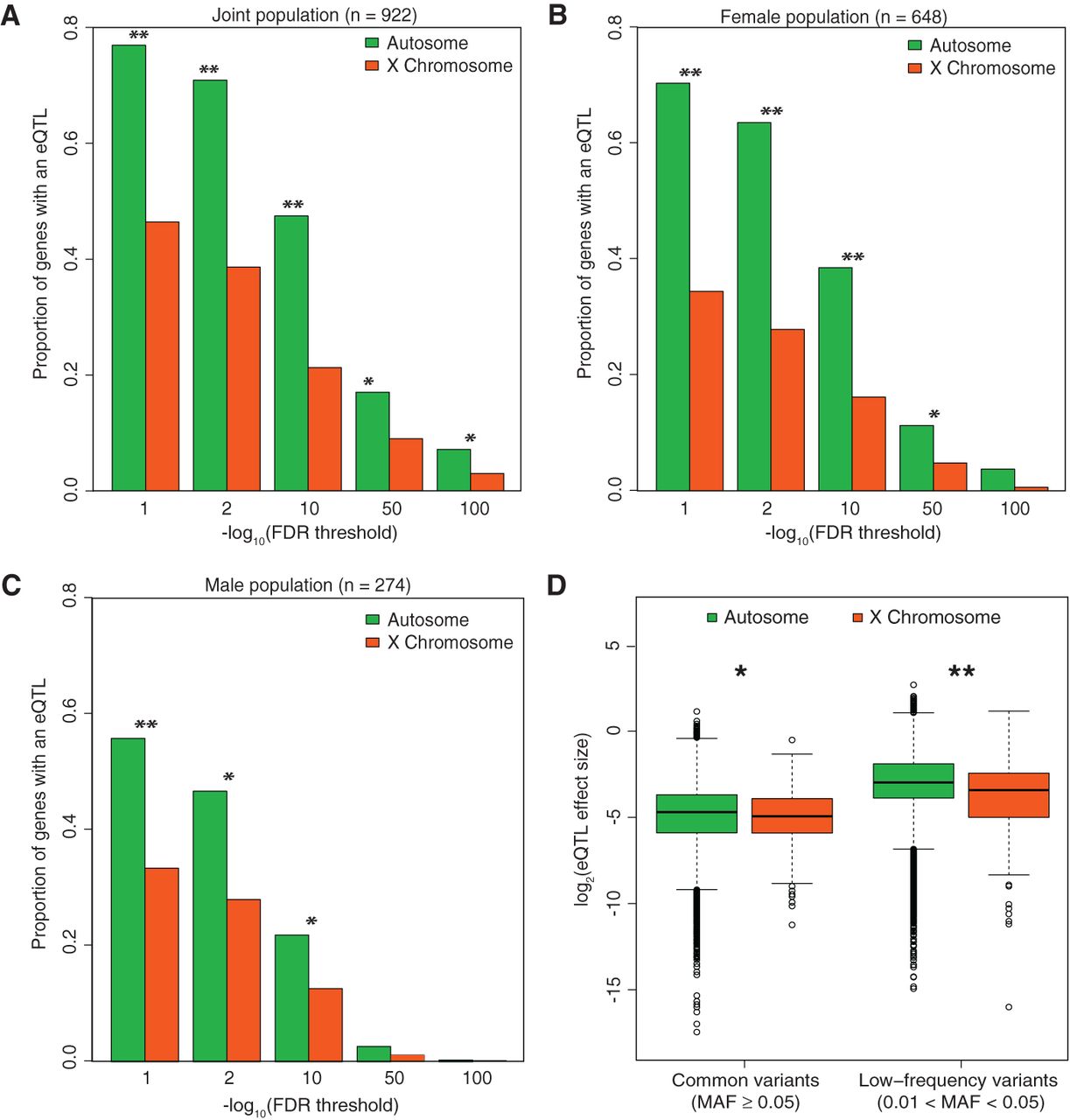 Characterization of eQTLs on the X Chromosome. (A) Proportion of genes with an eQTL at different FDR thresholds discovered in the joint (n = 922), (B) female (n = 648), and (C) male (n = 274) populations. (**) P-value < 1 × 10−15, (*) P-value < 0.05, Bonferroni adjusted χ2 test. (D) Comparison of eQTL effect size between autosomes and the X Chromosome for common variants (MAF ≥ 0.05) and low-frequency variants (0.01 < MAF < 0.05). The difference in effect size is statistically significant for both common ([*] P-value = 0.0382, two-sided Wilcoxon rank-sum test) and low-frequency variants ([**] P-value = 1.21 × 10−7).
