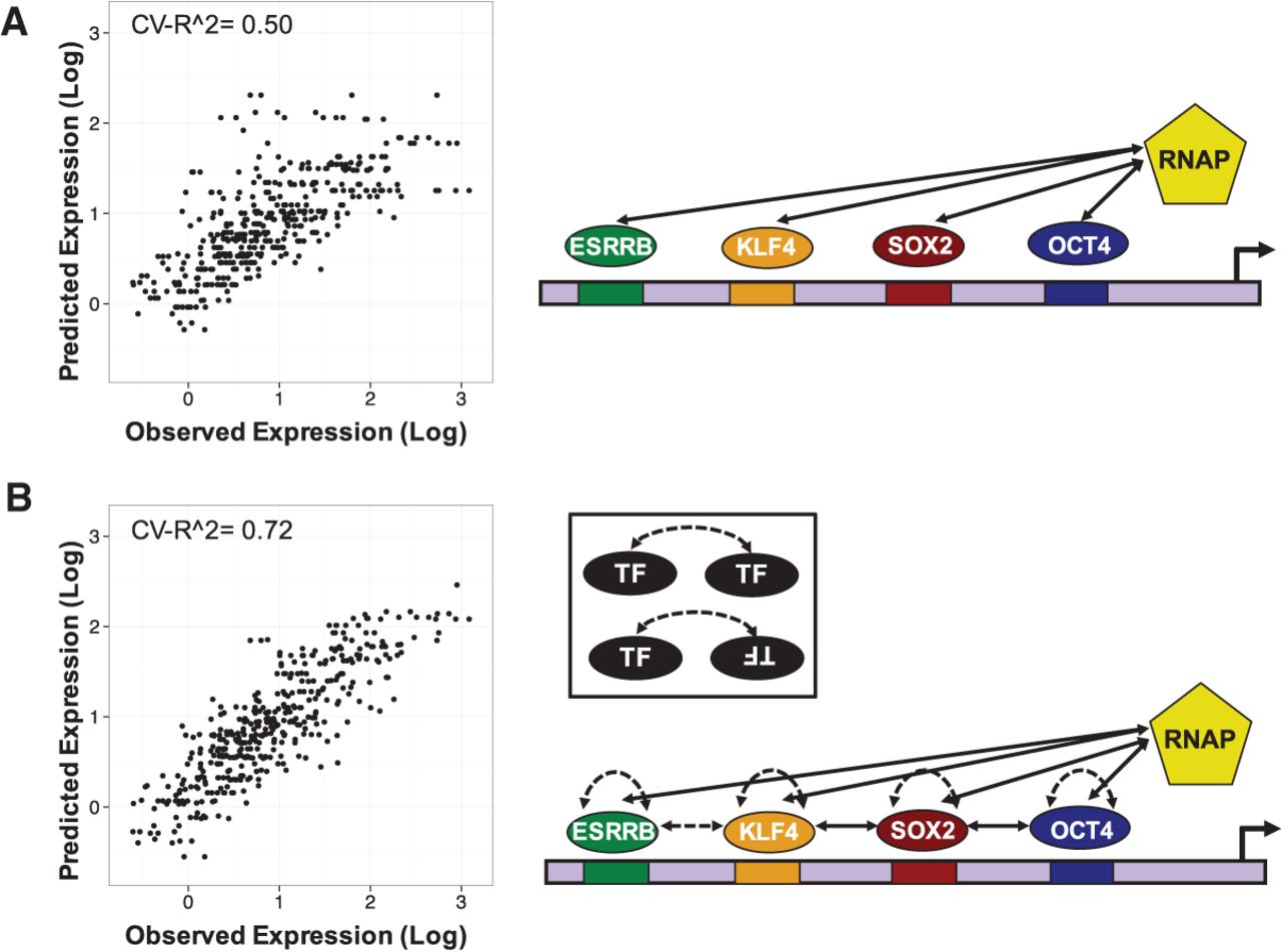 Thermodynamic model of OSKE library. In scatter plots, observed expression of each CRE from massively parallel reporter assays (Supplemental Fig. S1; Supplemental Data S1) is plotted on the x-axis, and the predicted expression of each CRE by the model is on the y-axis. In depictions of models, solid lines represent interactions following the “neighboring” rule, and dashed lines represent interactions following the “across” rule (Supplemental Fig. S2). See Table 1 for parameter values. (A) Model with only four TF–RNAP interaction parameters predicts expression with cross-validated R2 of 0.50. (B) Full model with five TF–TF interaction parameters in addition to four TF–RNAP interaction parameters predicts expression with cross-validated R2 of 0.72. Interactions were validated using genomic data (Supplemental Fig. S3).