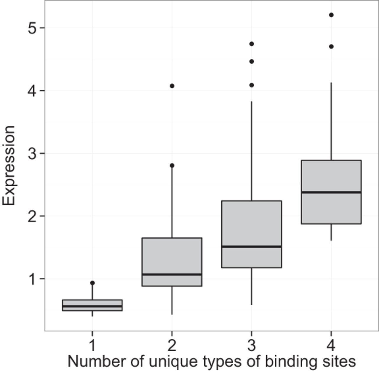 Expression by unique types of binding sites. Expression of CREs in the OSKE library with four total TFBS by the number of unique types of binding sites in the CRE (number of TFs for which binding sites are represented). Data are represented as box plots. Within the group with two unique types of binding sites, CREs with two sites of each type have higher expression than CREs with three sites of one type and one site of the other type (Supplemental Fig. S4).