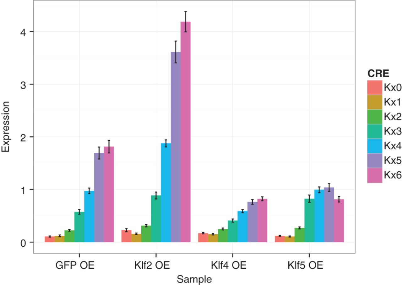 Expression of CREs with only KLF4 binding sites in overexpression backgrounds. Expression of the basal promoter and CREs with one to six KLF4 binding sites in each of the four overexpression (OE) conditions. Expression represented as mean ± SEM (Supplemental Data S1). See text for relevant statistical comparisons. Expression of the Klf genes in the OE conditions can be found in Supplemental Figure S5. Notably, Klf4 and Klf5 are both overexpressed in the Klf5 overexpression condition. The expression predictions of the thermodynamic model can be found in Supplemental Figure S6. Biochemical signal of clusters of KLF4 sites in the genome can be found in Supplemental Figure S7.