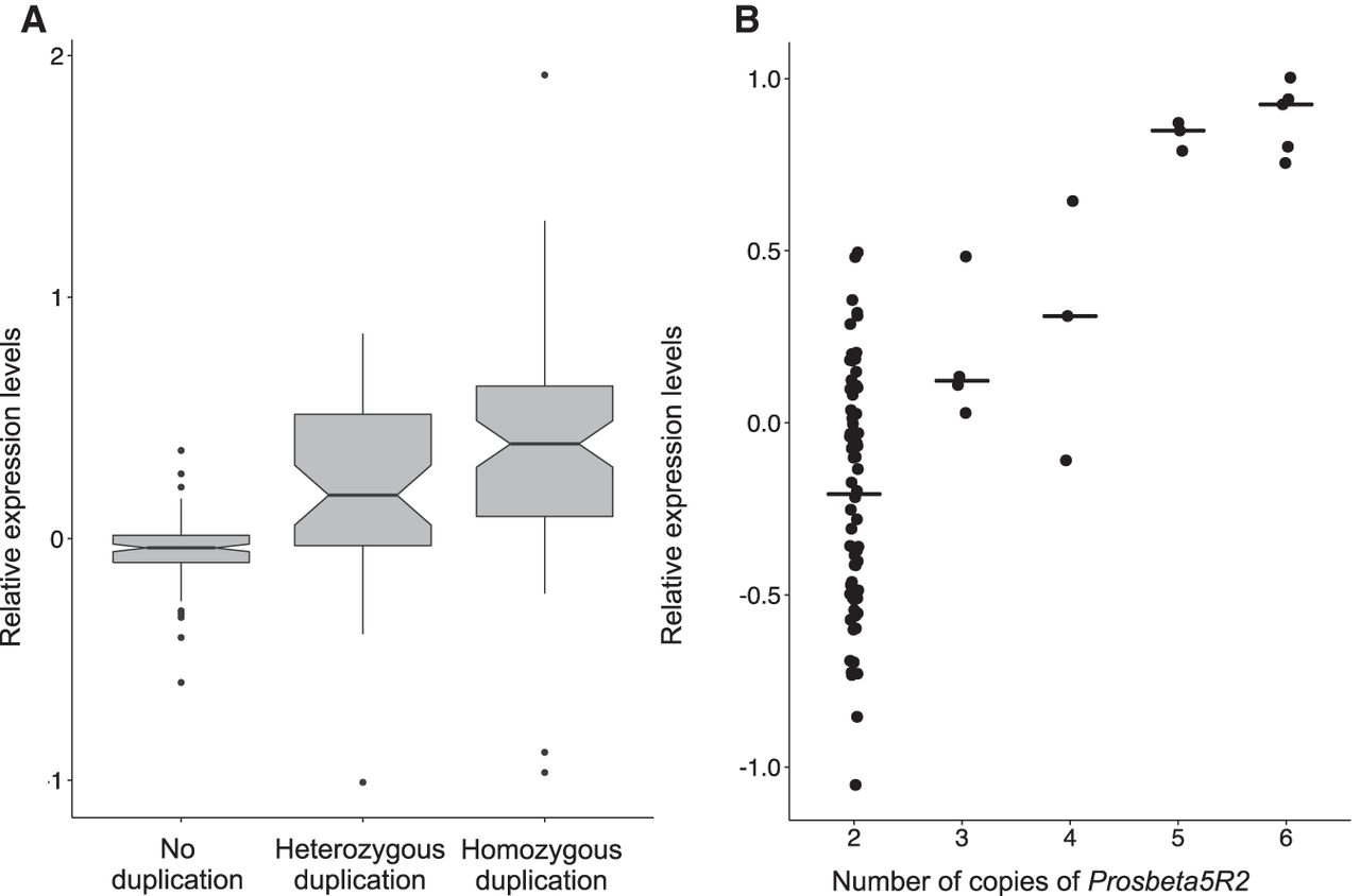 Relationship between gene copy number and gene expression. (A) Expression levels for genes duplicated in only one line in lines not carrying the duplication and in lines carrying heterozygous and homozygous duplications. (B) An increase in gene copy number is associated with an increase in the expression levels of Prosbeta5R2. The ancestral diploid state for this gene is two copies and its copy number can be as high as six in lines carrying three homozygous duplications.