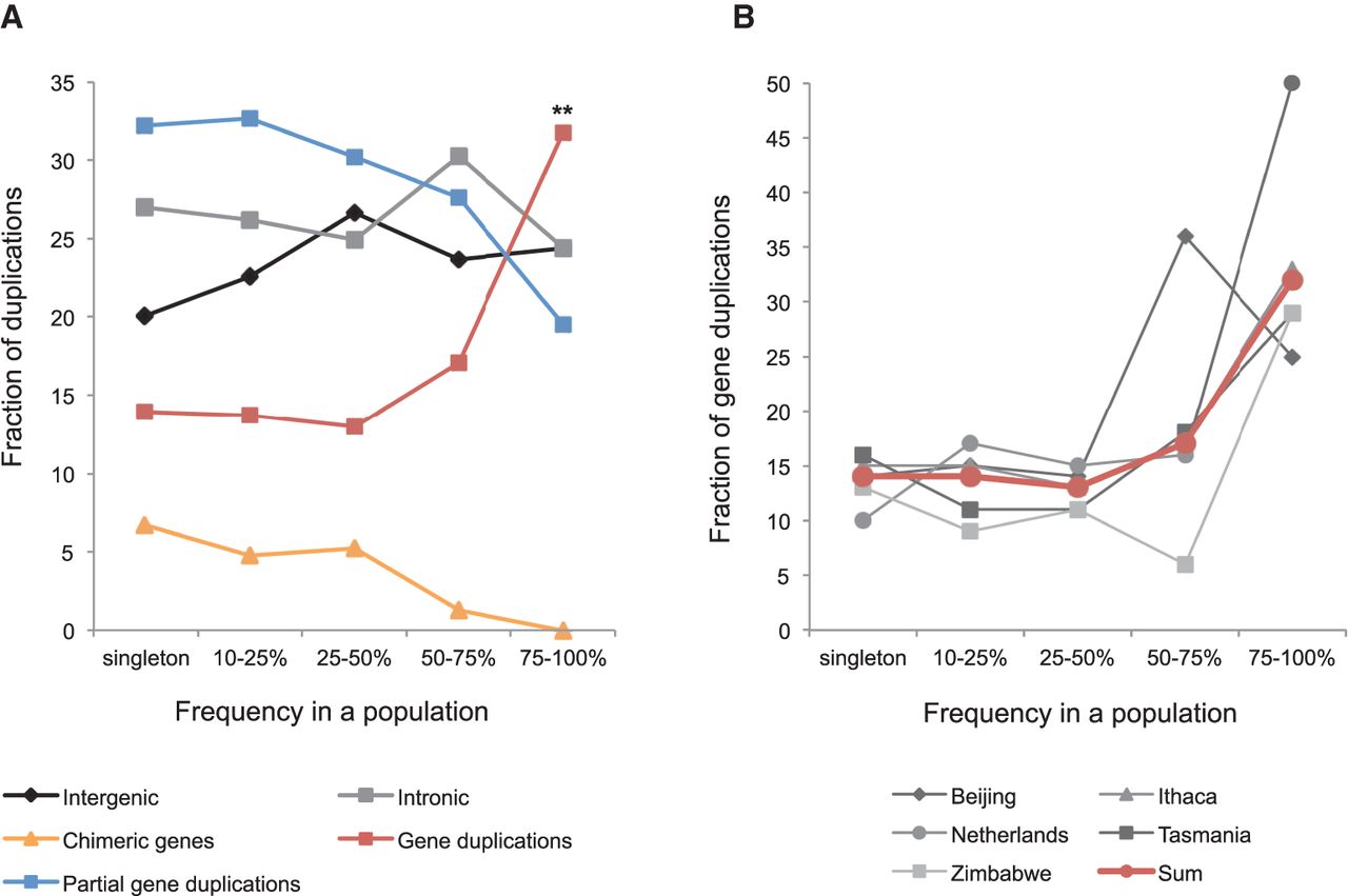 Gene duplications are significantly enriched among all high-frequency duplications. (A) For bins of increasing frequency, we plot the fraction of duplications (per bin) that overlap different genomic contexts. The data shown represent the combined data from the five populations for the subset of autosomal duplications. The asterisks indicate that gene duplications are significantly enriched among all duplications segregating in at least 75% of the lines (Fisher's exact test, P = 0.02 vs. all duplications, P = 0.03 vs. intronic/intergenic duplications). (B) Subset of A showing for the five populations (in gray) and for the combined data (in red) the fraction of duplications that corresponds to gene duplications across the different frequency bins.