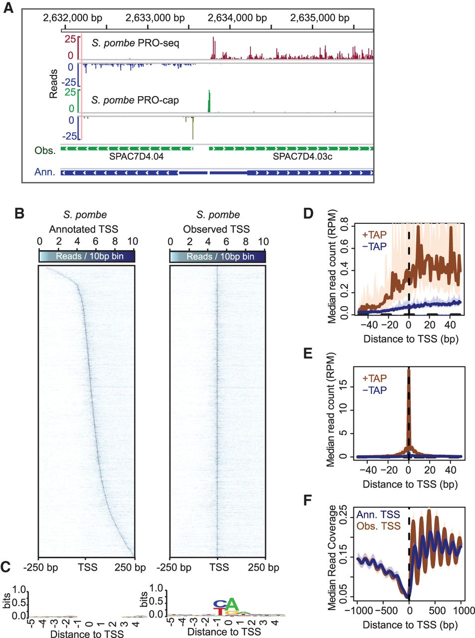 PRO-seq and PRO-cap capture transcription elongation and initiation genome-wide in S. pombe. (A) Browser tracks of PRO-seq (plus strand: red; minus strand: blue) and PRO-cap data (plus strand: green; minus strand: olive) derived from S. pombe. Green gene models below the data tracks show the reannotated, “observed” transcription start-sites based on PRO-cap data. Blue gene models correspond to the available annotations of genes. (B) Heatmaps of S. pombe PRO-cap signal for each base within ±250 bp around the annotated TSS (left) and PRO-cap observed TSS (right) for all active and filtered genes (n = 3214). Genes within heatmaps are sorted by increasing downstream distance of observed TSS relative to annotated TSS. (C) Sequence logos of 10-bp sequence centered on either annotated TSS (left) or observed TSS (right) generated using WebLogo (Crooks et al. 2004). (D) PRO-cap signal from samples prepared either with or without Tobacco Acid Pyrophosphatase (TAP) treatment centered on annotated TSS. The TAP-minus samples represent empirical levels of background for each genomic position. (E) Median PRO-cap signal from samples prepared either with or without TAP treatment centered on observed TSS. (F) Median MNase-seq coverage centered on annotated TSSs (blue) or observed TSSs (brown). For the metagene plots, the y-axis shows the median read counts for each base-pair (D,E), or median read coverage within 10-bp bins (F). In D, E, and F, the 12.5% and 87.5% quantiles are shown in lightly shaded regions.
