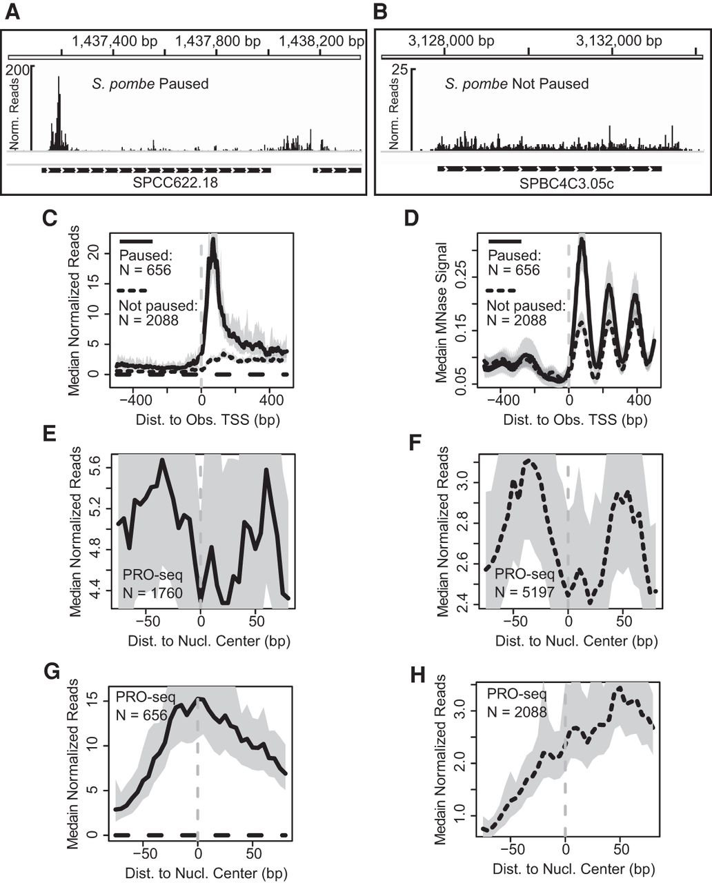 Pol II distributions at paused genes in S. pombe are coupled with increased nucleosome occupancy or positioning. (A,B) Browser images of PRO-seq read counts across S. pombe genes classified as either high-confidence paused (A) or not paused (B). (C) Median PRO-seq read counts within 1 kb upstream of and downstream from the observed TSS of paused and not paused genes. (D) Median MNase-seq read coverage within 1 kb upstream of and downstream from the observed TSS of paused and not paused genes. (E,F) PRO-seq signal around gene-body nucleosome centers for paused (E) and not paused genes (F). (G,H) PRO-seq signal around +1 nucleosome centers for paused (G) and not paused genes (H). For metagene plots in C–H, medians reflect 5-bp bins, and the 12.5% and 87.5% quantiles are shown as shaded regions. All panels represent profiles of combined wild-type biological replicates.