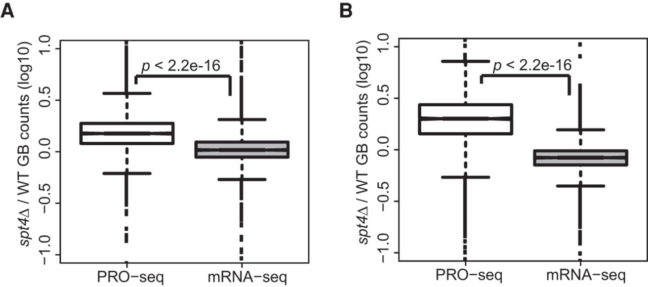Global increase in Pol II density in spt4Δ does not result in increased transcript abundance in S. cerevisiae or S. pombe. (A,B) Box plots comparing the fold change in gene-body PRO-seq density resulting from the deletion of Spt4 with the corresponding change in poly-A selected RNA-seq in S. cerevisiae (A) and S. pombe (B). P-values represent the results of Student's t-test.