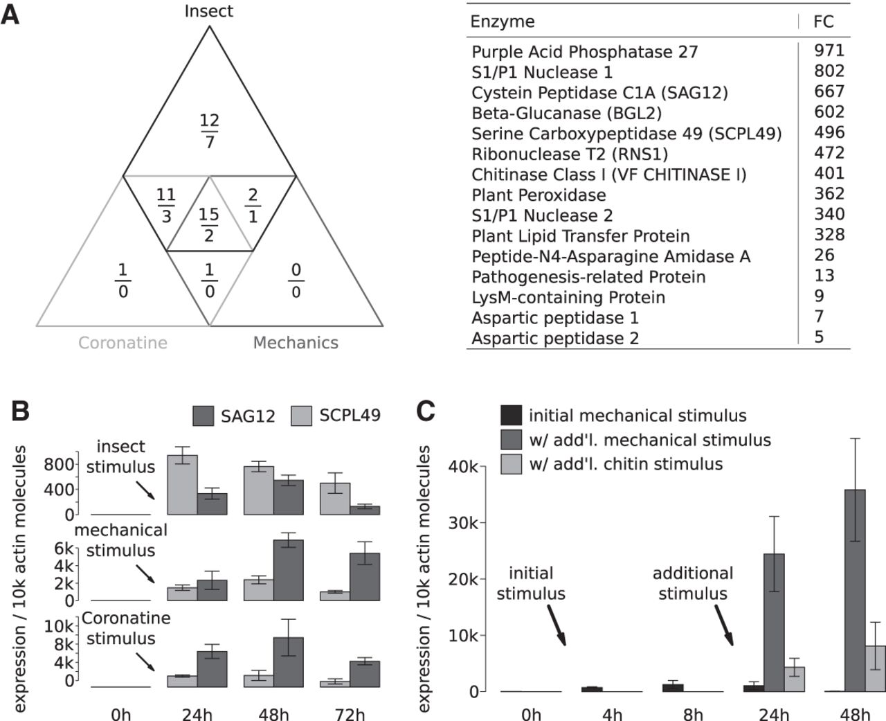 The Dionaea hydrolase cocktail is activated synergistically by touch and taste. (A, left) Venn diagram of potential secretome members from an overlay of RNA-seq data (nonstimulated and insect-stimulated glands) and HTS proteomic measurements of secreted fluid from chemically (COR), mechanically, and insect-stimulated traps. Numbers indicate up-regulated (top) and down-regulated (bottom) transcripts. Potential candidates are limited to transcripts that are differentially regulated, contain a proper signal peptide, and are detected at least once using HTS proteomics. (A, right) List of potential secretome members differentially up-regulated after insect stimulation and detected in all three HTS proteomic measurements. (B) qPCR time course of Dionaea marker hydrolases SCPL49 and SAG12 in response to insect, mechanical, and COR stimulation. Both enzymes are up-regulated several thousand-fold after stimulation. Expression at time point 0 h is within statistical noise. (C) Synergistic stimulation of VF CHITINASE I expression in response to an initial mechanical stimulation followed by a chemical stimulus (chitin).