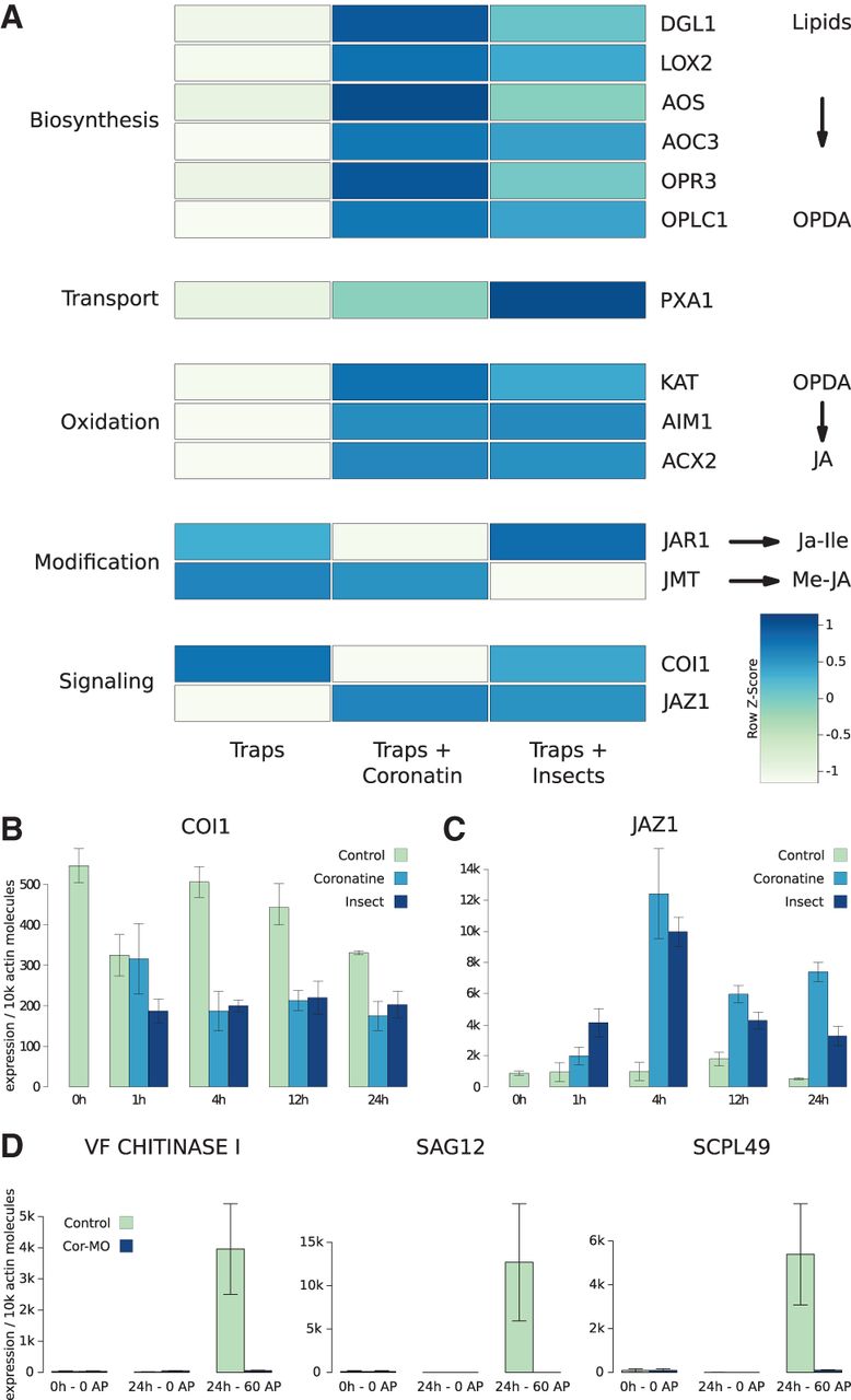 Activated Venus flytraps show signs of elevated jasmonate signaling. (A) Heat map depicting the expression of key genes mediating jasmonate biosynthesis, transport, and signaling in activated (COR/insect) versus nonstimulated traps. Expression values are scaled by rows (Z-scoring). The majority of the components are transcriptionally activated by insect or COR stimulation in traps and glandular tissue. Genes encoding the key enzymes of jasmonic acid (JA) biosynthesis such as LOX2 (LIPOXYGENASE 2), AOS (ALLENEOXIDE SYNTHASE), and OPR3 (OXOPHYTODIENOATE-REDUCTASE 3) were highly induced in insect- and COR-stimulated traps and glands. Likewise, the ABC-transporter PXA1 (PEROXISOMAL ABC-TRANSPORTER 1) mediating the import of the JA precursor OPDA (12-oxo-phytodioneic acid) into peroxisomes, and peroxisomal enzymes of the beta-oxidation chain generating JA from OPDA were stimulus induced. JAR1 (JASMONIC ACID RESISTANT 1), which finally converts JA into its physiologically active form JA-Ile, appears specifically induced by insects. (B,C) Quantitative PCR (qPCR) of the Dionaea JA receptor COI1 (CORONATINE INSENSITIVE 1) and its coreceptor/repressor JAZ1 (JASMONATE-ZIM-DOMAIN 1). (D) Effect of the JA-antagonist coronatine-O-methyloxime (COR-MO) on electro-mechanical induction of hydrolase expression. Traps were pretreated 4 h before application of zero or 60 APs with H2O (green) or 100 μM COR-MO (blue). Transcript numbers are given relative to 10,000 molecules of DmACT1 ± SE, n = 6. RNA was sampled after 24 h in response to zero or 60 recorded action potentials (APs). qPCR Abbreviations are as follows: (DGL) DONGLE, PLA1-type phospholipase; (LOX2) LIPOXYGENASE 2; (AOS) ALLENE OXIDE SYNTHASE; (AOC3) ALLENE OXIDE CYCLASE 3; (OPR3) 12-OXOPHYTODIENOATE REDUCTASE 3; (OPCL1) OPC-8:0 COA LIGASE1; (PXA1) PEROXISOMAL ABC TRANSPORTER 1; (KAT) PEROXISOMAL 3-KETOACYL-COA THIOLASE 3; (AIM1) ABNORMAL INFLORESCENCE MERISTEM; (ACX2) ACYL-COA OXIDASE 2; (JAR1) JASMONATE RESISTANT 1; and (JMT) JASMONIC ACID CARBOXYL METHYLTRANSFERASE (Dave and Graham 2012).