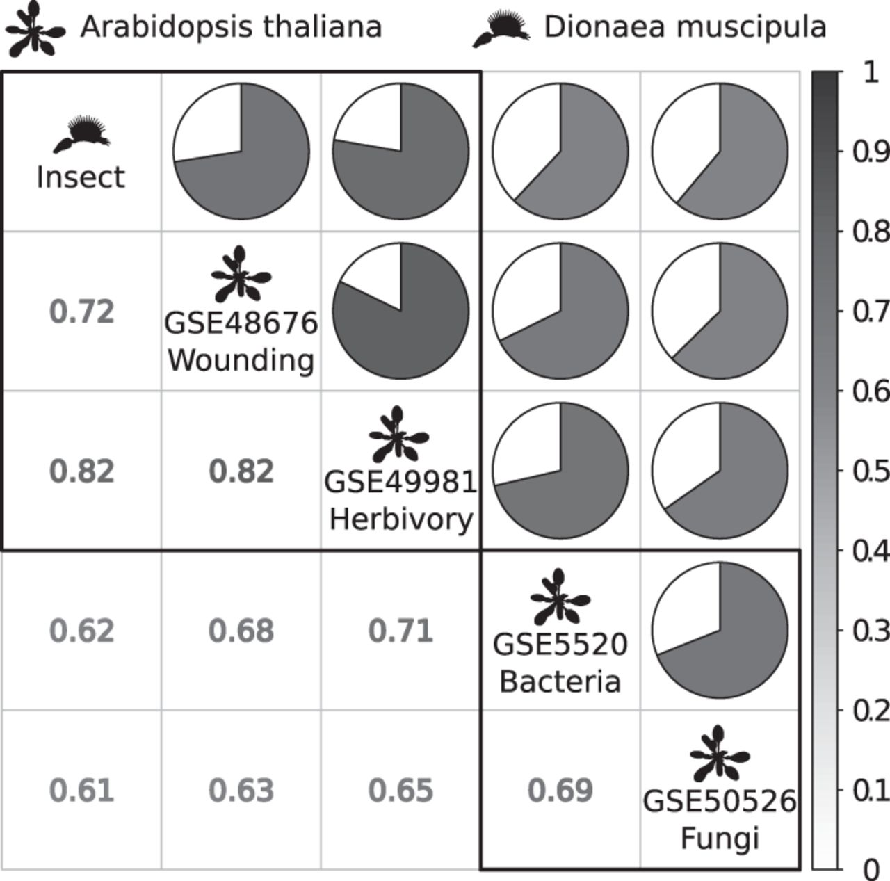 Prevailing signs of defense responses in active Dionaea traps. Semantic similarity between different Arabidopsis thaliana microarray experiments (GSE48676, GSE49981, GSE5520, and GSE50526) and active (insect-activated) traps. The semantic similarity is calculated by a quantitative comparison of all sets of significantly enriched gene ontology terms for each individual experiment. The lower triangle shows individual gene ontology similarities while the upper triangle visualizes the similarity as a relative pie chart. Black frames indicate results of the hierarchical clustering procedure using “complete” as agglomeration method.