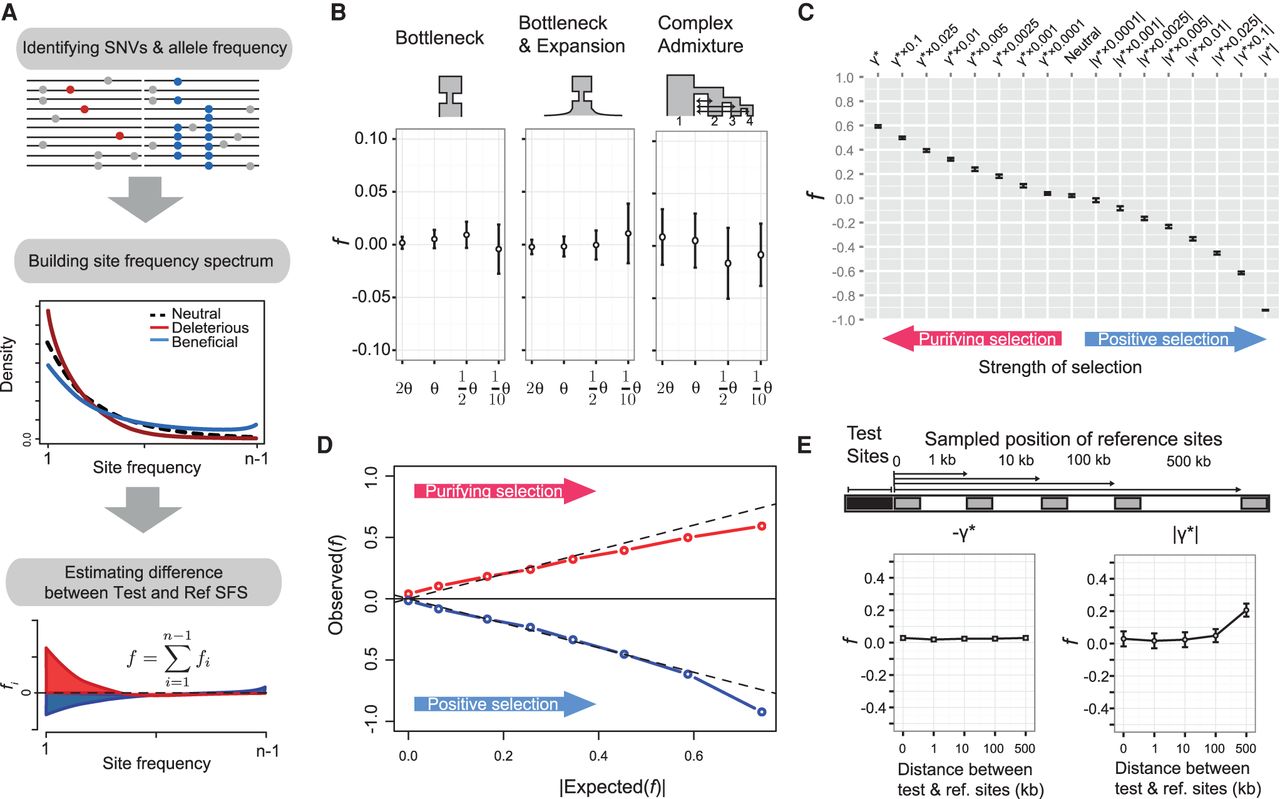 A nonparametric approach for estimating the fraction of SNVs under selection. (A) Schematic illustration of the method to estimate f by comparing a test SFS to a putatively neutral reference SFS. The fraction of deleterious (red) and advantageous (blue) SNVs is estimated as the scaled difference between test and reference SFS (see Methods). (B) Estimates of f when test and reference sites have different mutation rates (the test SFS was set to θ) for a different demographic model. The estimate of f in the population structure model is from population one. (C) Estimates of f as a function of strength of selection assuming the same demographic model as in B. (γ*) Baseline selection model (Boyko et al. 2008). (D) Comparison between observed and expected estimates of f (|s| > 0.0001) inferred from the distribution of selection coefficients. (E) Estimates of f for neutral mutations linked to selected sites (black region) as a function of distance from reference sites (gray regions).