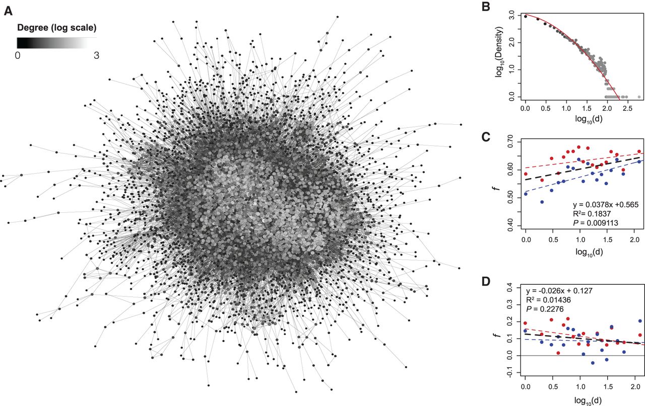 Higher burden of nonsynonymous SNVs for proteins at the center versus periphery of protein–protein interaction networks. (A) PPI network of 6700 protein-coding genes with 56,728 significant connections (STRING score >0.7). Each protein is a node and is shaded by the number of interactions (degree). (B) Relationship between the average number of interacting proteins (x-axis) and the degree of connectivity (y-axis) for the PPI network. (C) Relationship between the average number of interacting protein neighbors on estimates of f at nonsynonymous SNVs, showing significantly increased purifying selection on genes located at center rather than periphery of the PPI network. (D) No significant relationship between the average number of interacting proteins on estimates of f at synonymous sites.
