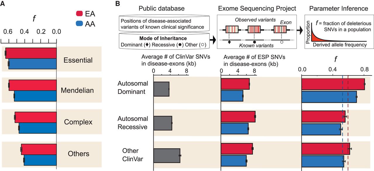 Intensity of purifying selection on nonsynonymous SNVs in disease related genes. (A) Estimates of f in genes designated as Essential, Mendelian, Complex, or Others (for details, see text). (B) Estimates of f from SNVs in exons with reported disease causing mutations as a function of mode of inheritance. The top panel provides a schematic illustration of the analysis, including intersection between exons containing ClinVar reported mutations and nonsynonymous SNVs in ESP. The plots below show the number of nonsynonymous SNVs/kb estimated from ClinVar and ESP, as well as estimates of f as a function of mode of inheritance. Dashed lines denote the average f for nonsynonymous SNVs in EAs (red) and AAs (blue).