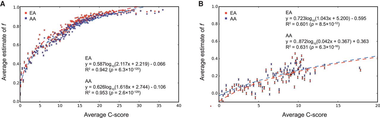 Relationship between predicted pathogenicity of SNVs and estimate of f in populations. The average estimate of f on nonsynonymous (A) and synonymous (B) SNVs was computed on each bootstrapped subset of SNVs in each bin by using a quantile-binning approach, such that each bin had the same number of SNVs. Error bars, SEM scaled C-score (x-axis) and mean estimate of f (y-axis). The red (EA) and blue (AA) lines represent the best fit curves to the data.