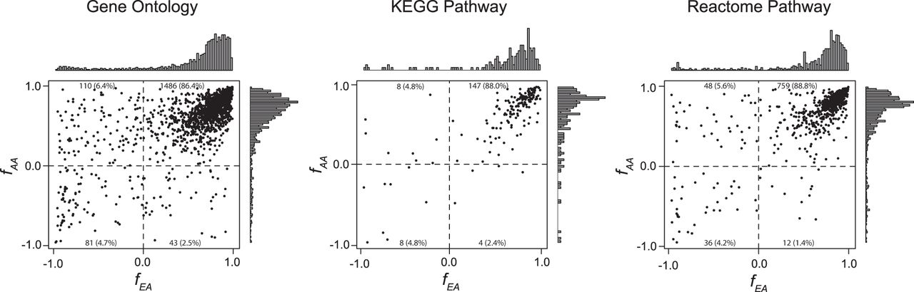 Natural selection on pathways. Estimates of f in EAs and AAs were calculated for nonsynonymous SNVs for genes across all categories in Gene Ontology, KEGG pathways, and Reactome pathways. The number (and proportion) of categories in each of the four quadrants is shown in each panel.
