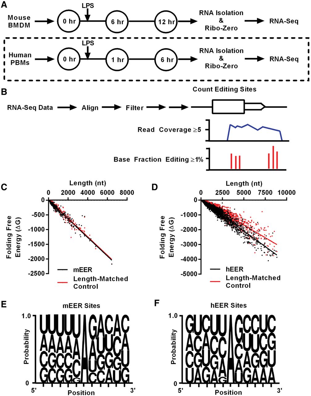 Identification of EERs in murine macrophages and human monocytes. Experimental setup for RNA-seq analysis of LPS-stimulated (A) mouse BMDMs and human PBMs. Dashed line indicates analysis of existing data sets (Lissner et al. 2015). (B) Brief description of identification of EERs, detailed in Supplemental Figure S1. Folding free energy (ΔG) versus length (nt) plot of (C) mEERs (P = 0.1581) and (D) hEERs (P < 0.0001) compared to length-matched controls. P-values determined by Wilcoxon matched-pairs signed rank test. Weblogos for A-I editing sites in (E) mEERs and (F) hEERs using sites in ≥1% of reads of EERs for all samples combined (Seq2Logo Sequence Logo Generator) (Thomsen and Nielsen 2012). Known SNPs were removed from analyses.