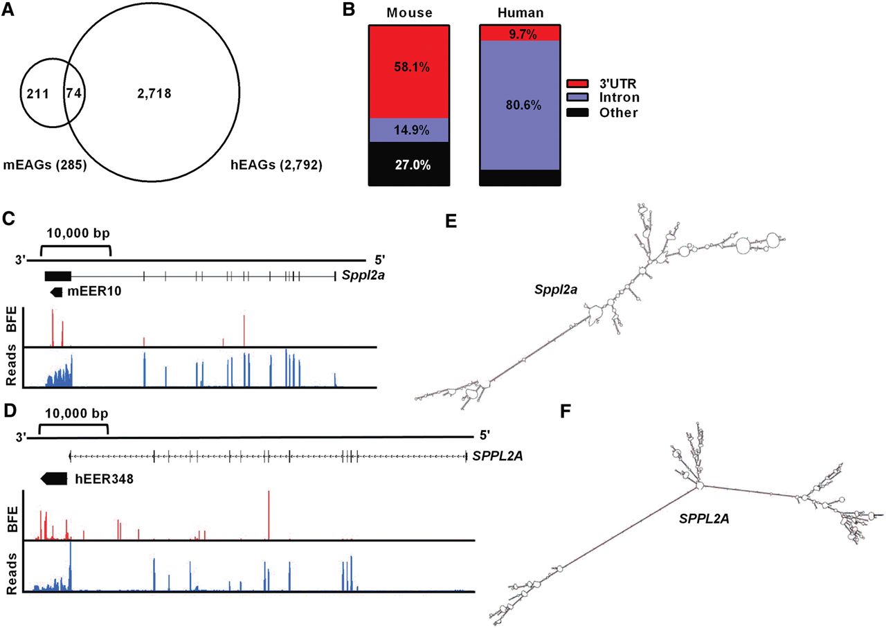 A subset of mEAGs also have EERs in the human ortholog. (A) Intersection of mEAGs with hEAGs (P < 0.0001 by χ2 test). (B) Primary intersecting feature of conserved EAGs defined as 3′ UTR, Intron, or Other. Gene structure, EER location, base-fraction editing (red, BFE 0%–100%), and relative expression (blue, FPKM, 0–10 reads) are shown for mouse (C) and human (D) Sppl2a/SPPL2A orthologs. Data are for 6 h post-LPS treatment of mouse BMDMs and human PBMs. Mfold-predicted EER structures are compared to the right (E,F).