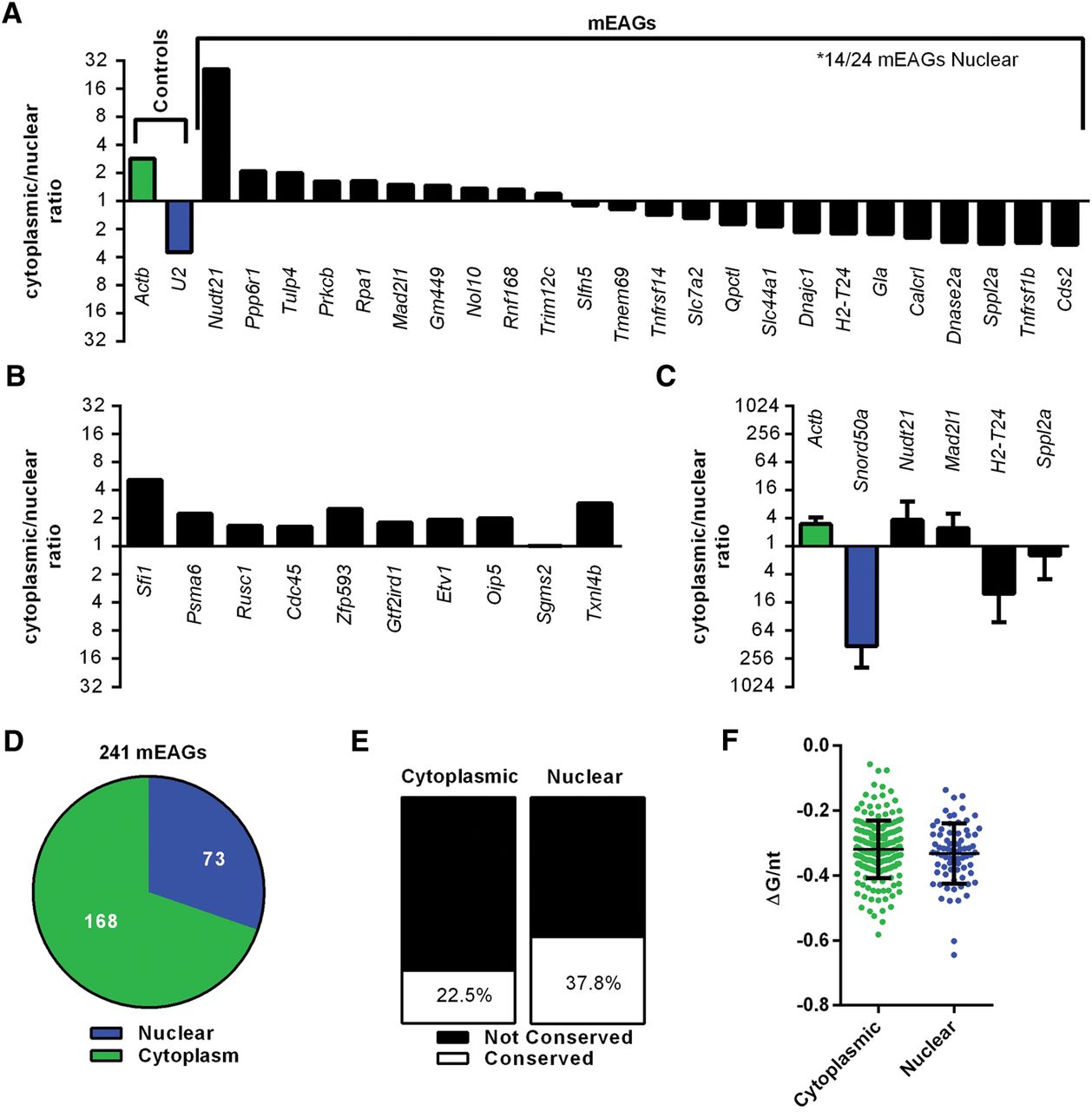A subset of mEAG transcripts is enriched in the nucleus. Data sets for unstimulated BMDMs (Bhatt et al. 2012) were used to determine the cytoplasmic to nuclear ratio of transcripts for (A) controls and TOP25 mEAGs and (B) 10 randomly selected protein-coding genes. (C) Validation of controls and mEAGs using qRT-PCR of RNA isolated from nuclear or cytoplasmic fractions of unstimulated RAW264.7 macrophages. (D) Predominant cellular localization for all mEAGs using Bhatt et al. data sets. (E) Predominant cellular localization of EAGs found in orthologs of both mouse and human. P = 0.01242 by Z test for two population proportions. (F) Folding free energy per nucleotide (ΔG/nt) for cytoplasmic and nuclear-localized mEERs. P = 0.9109 using Mann-Whitney U test.