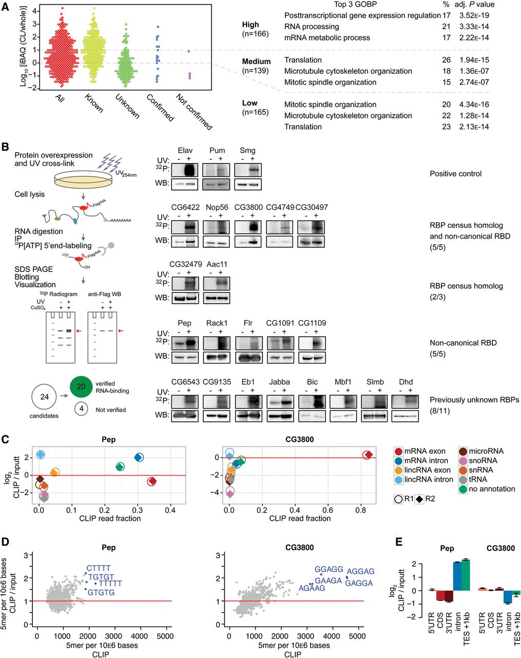 Validation of direct RNA interaction of candidate RBPs. (A) Protein enrichment (log10 iBAQ ratios of proteins in oligo[dT] precipitate versus whole-embryo proteins). Proteins are divided by enrichment score (high = >10-fold enrichment, middle = 1–10-fold enrichment, low = <1-fold enrichment) (six proteins [two validation candidates] missed whole embryo detection and could not be added here). The three most enriched GO-terms for biological processes (GOBP) for each category are shown on the right. Validation candidates were chosen throughout the enrichment ratio range, and were not annotated as RNA-binding in GOMF or having classical RBDs (except Pep). (B) Scheme describing the experimental approach. Epitope-tagged candidate RBPs were expressed in transiently or stably transfected Drosophila S2 cells. After 254-nm UV-crosslinking, cell lysis, and RNase digestion, the immunoprecipitated crosslinked protein-RNA complexes were radiolabeled by T4 PNK phosphorylation and separated by SDS-PAGE. 32P-autoradiogram and Western blot analysis of 254-nm UV-crosslinked (+) and noncrosslinked (−) complexes for each indicated RBP candidate are shown. Known RBPs (Elav, Pum, Smg), served as positive controls. RNA-signals were compared against FLAG-IP of crosslinked parental S2 cells to estimate nonspecific signal. RBP candidates Wech, GlyP, Hsc70Cb, and CG6287 could not be verified. (C) Enrichment of uniquely aligned CLIP sequencing reads relative to matched total RNA input for Pep and CG3800. X-axis: fraction of reads per million (RPM). Y-axis: log2-transformed RPM ratio of CLIP vs input samples. (Circles, replicate 1; diamonds, replicate 2.) (D) 5-mer enrichment of randomly sampled aligned RBP CLIP reads relative to matched inputs. X-axis: frequency of 5-mer in 106 bases. Y-axis: 5-mer frequency ratio CLIP vs. input. (E) Enrichment analysis of aligned sequencing reads to mRNA subannotation categories. Sequencing reads were normalized to reads per kilo base per million (RPKM). Y-axis: log2-transformed ratio of annotation categories RPKMs in CLIP vs. input. (TES) transcription end site.