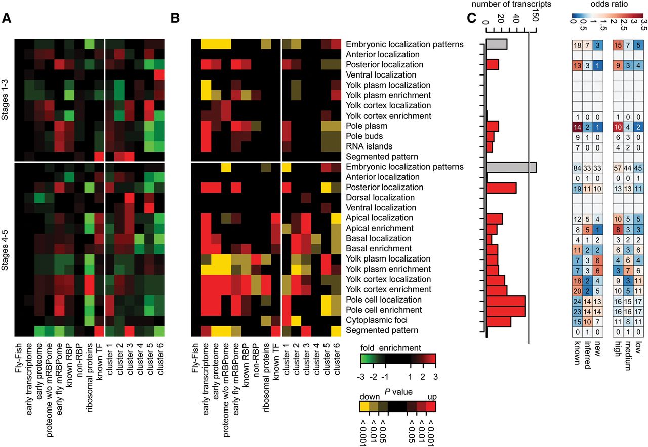 Localization of RBP-enocding mRNAs in early Drosophila embryos. RNA fluorescent in situ hybridization information from the Fly-FISH database (Lécuyer et al. 2007) was used to empirically calculate overrepresented transcript localization annotation terms by random sampling relative to the Fly-FISH database. Heat map indicating fold changes (A) and P values (B) for each subset for embryonic localization terms in embryonic developmental stages 1–3 and 4–5. Early transcriptome: protein coding genes expressed (FPKM > 0) in 0–2-h embryos; early proteome: proteins identified by whole 0–2-h embryo mass spectrometry; proteome without mRBPome: does not contain genes identified by mRBPome capture; known RBPs: RBPs selected by GO-term and RBD within the transcriptome excluding ribosomal proteins; non-RBP: transcriptome without known RBPs; ribosomal proteins: all ribosomal proteins; known TF: transcription factors from FlyTF.org database. Clusters as in Fig. 4A. Relative subset representation can be assessed in Supplemental Figure S5A. (C) The number of transcripts of the early fly mRBPome for each localization category. Gray bars = number for all transcripts with spatially restricted (≠ ubiquitous) embryonic localization terms within stages 1–3 and 4–5, respectively; red bars = number of transcripts in individual localization categories. Odds ratio of subcategories relative to the early fly mRBPome. Subcategories represent classification from Figures 2D and 3A.