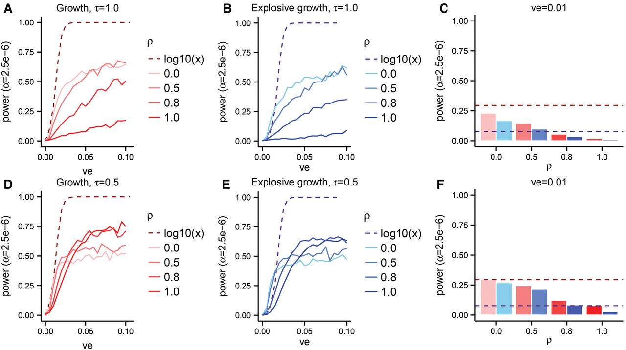 The power of SKAT-O in Europeans as a function of the variance explained (ve) by a gene on a phenotype in a sample of size n = 104 chromosomes under various effect size models. The explosive growth model (B,E) of Tennessen et al. (2012) is shown in shades of blue, and the growth model (A,D) of Gravel et al. (2011) is shown in shades of red. The dashed lines show the power when the effect sizes are taken to be proportional to log10(x) for alleles at frequency x, whereas the solid lines (A,B,D,E) and bars (C,F) show results from our phenotype model. Panel C aggregates data from A and B for ve = 0.01, while panel F aggregates data from D and E for ve = 0.01.