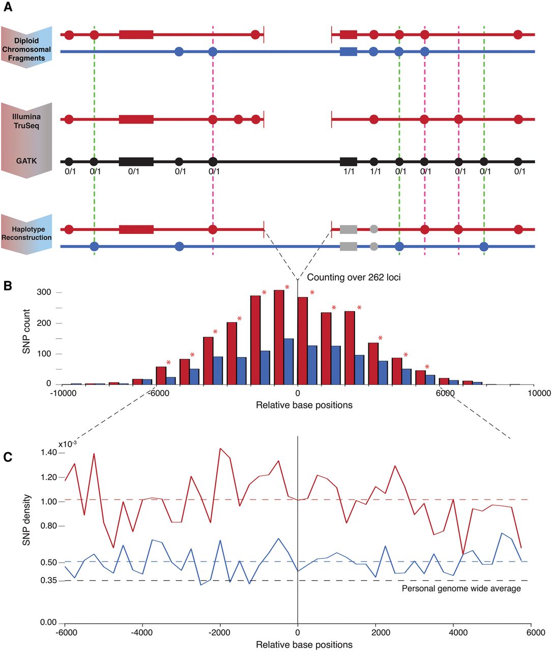 Schematic and results of the analysis. (A) Personal real haplotypes with deletion (red) and without deletion (pure blue) are shown along with flanking SNPs/indels depicted by filled circles/rectangles. TruSeq data allows resolving SNPs/indels on the haplotype with deletion (the set of in-phase variants). The GATK variant calls (black) include SNPs/indels for both haplotypes and also provide genotype information. The reconstructed haplotype without deletion (the set of out-of-phase variants) is obtained through complement of GATK to TruSeq calls. Only heterozygous SNPs/indels are further counted. The dashed pink/green lines highlight error cases that increase the count for the haplotype with/without deletion, respectively. The pink errors are highly unlikely (see text), and the green cases can only contribute against our result. (B) Histogram showing the count of heterozygous SNPs on both haplotypes with respect to distance from the deletions’ breakpoints. A total of 262 loci with heterozygous deletions are considered. Statistically significant differences (by Z-test) in SNP counts in bins marked by star are observed in 6-kbp flanking windows. (C) Densities of heterozygous SNPs on haplotypes with and without deletions are roughly constant and higher than personal genome-wide average per haplotype. The density with deletions is twice as high as without. In-phase indel density is 33% higher than out-of-phase (not shown in figure).