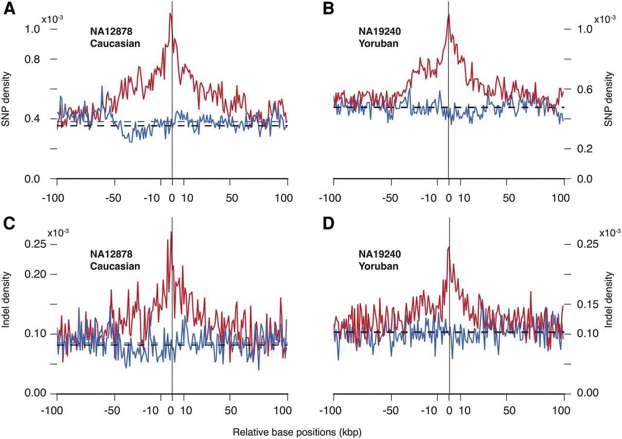 Densities of in-phase (red) and out-of-phase (blue) heterozygous SNPs/indels flanking deletions in (A,C) Caucasian (NA12878) and (B,D) Yoruban (NA19240) individuals. Densities are obtained from trio-based haplotype reconstruction. Average out-of-phase densities for the displayed interval are shown by dashed lines (blue). Genome-wide average densities of heterozygous SNPs per haplotype are shown by black dashed lines. In the Yoruban trio, average out-of-phase and genome-wide densities are almost the same.