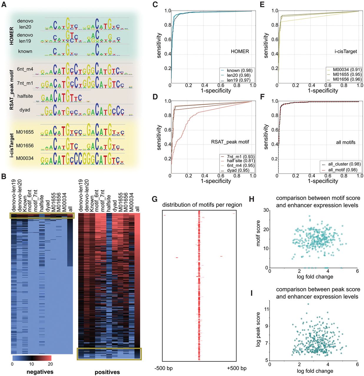TP53 enhancer model. (A) Ten motifs were selected from motif discovery tools i-cisTarget, HOMER, and RSAT peak motif. (B) Heatmap showing the best Cluster-Buster score for each peak of the nonresponsive (negatives) and TP53-responsive (positives) subset. Discordance between PWM scores and CHEQ-seq are indicated with a yellow box. (C–E) Classification accuracy for each PWM shown as ROC curves. (F) Comparison of a single maximum score (red) versus a homotypic cluster of motifs (black dashed). (G) All positive regions with 1-kb flanking sequence centered on the best scoring motif illustrating the absence of binding site clusters. (H,I) TP53 enhancers are binary on/off enhancers as shown by the lack of correlation between the motif score and barcode expression (H), as well as the lack of correlation between the peak score and the barcode expression (I).