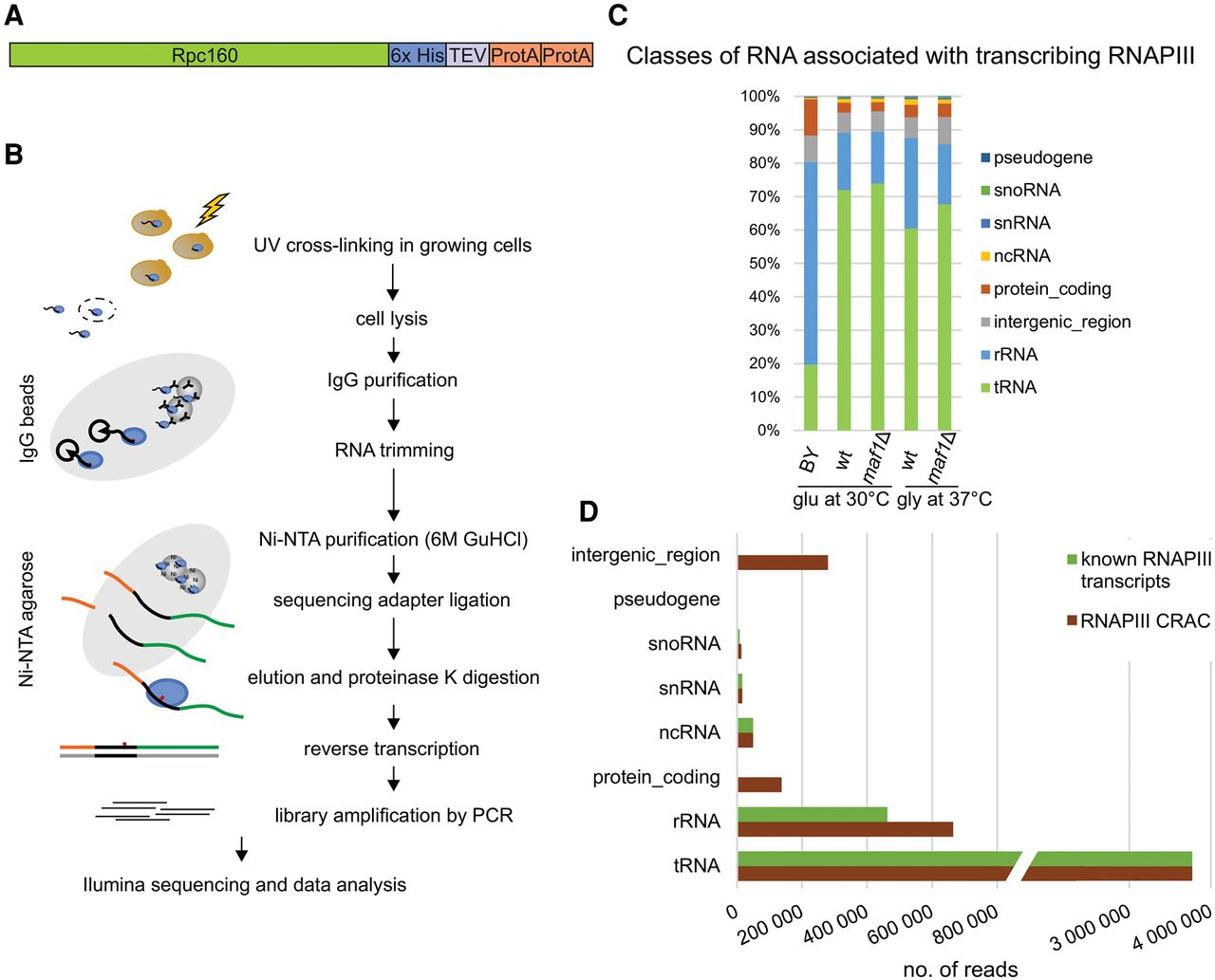 Outline and validation of RNAPIII CRAC. (A) Scheme of Rpo31-HTP fusion (commonly known as Rpc160-HTP) including a C-terminal His6-TEV protease cleavage site-protein A (HTP) tag for CRAC purification. (B) Outline of the CRAC crosslinking protocol. (C) Transcriptome-wide binding profiles for MAF1 (wt) and maf1Δ strains encoding Rpo31-HTP and for the control BY strain expressing untagged Rpo31. Bar diagrams illustrate the percentage of all sequences mapped to each of the RNA classes indicated on the right of the figure. (D) Graphical comparison of the total numbers of reads recovered in RNAPIII CRAC with reads from known RNAPIII transcripts, divided into classes.
