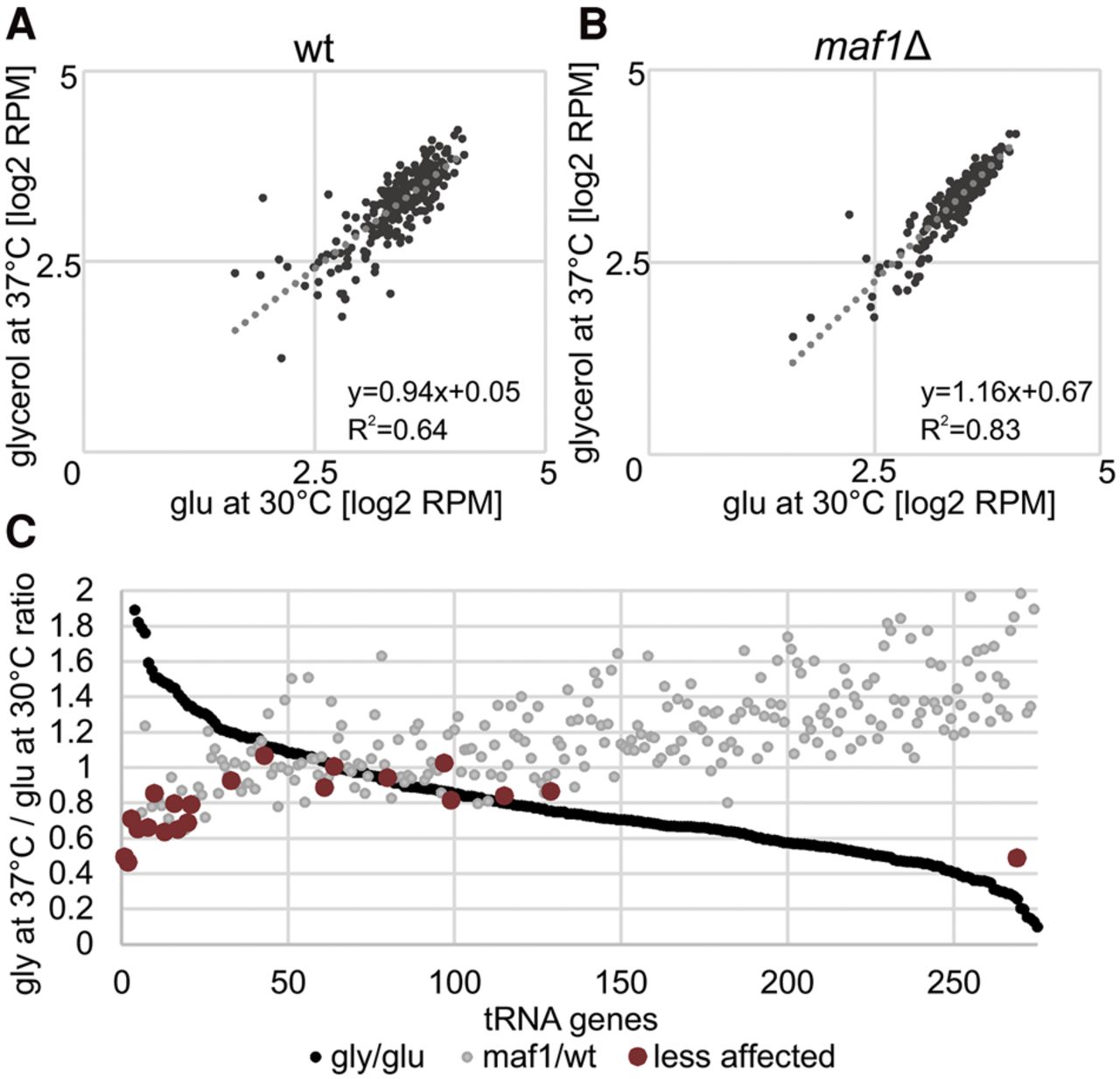 Comparison of genome-wide tRNA genes transcription under different growth conditions. (A) Correlation of relative expression of nuclear tRNA genes between permissive and repressive conditions for wt strain. The correlation coefficient (R2) reflects how well the data fit the trend line. Two outlying bottom points are not shown. (B) Correlation of relative expression of nuclear tRNA genes between permissive (glucose at 30°C) and repressive conditions (glycerol at 37°C) for maf1Δ strain. Two outlying bottom points are not shown. (C) Ratios of relative expression level of all nuclear tRNA genes under stress conditions. A subset of tRNA genes is less responsive to regulation by Maf1. Genes are ordered according to the Gly:Glu expression ratio (the highest value for tD(GUC)N = 14.78 is not shown). In the same order, the maf1Δ:wt ratio is plotted. The least affected tRNA for each amino acid is colored in dark red.