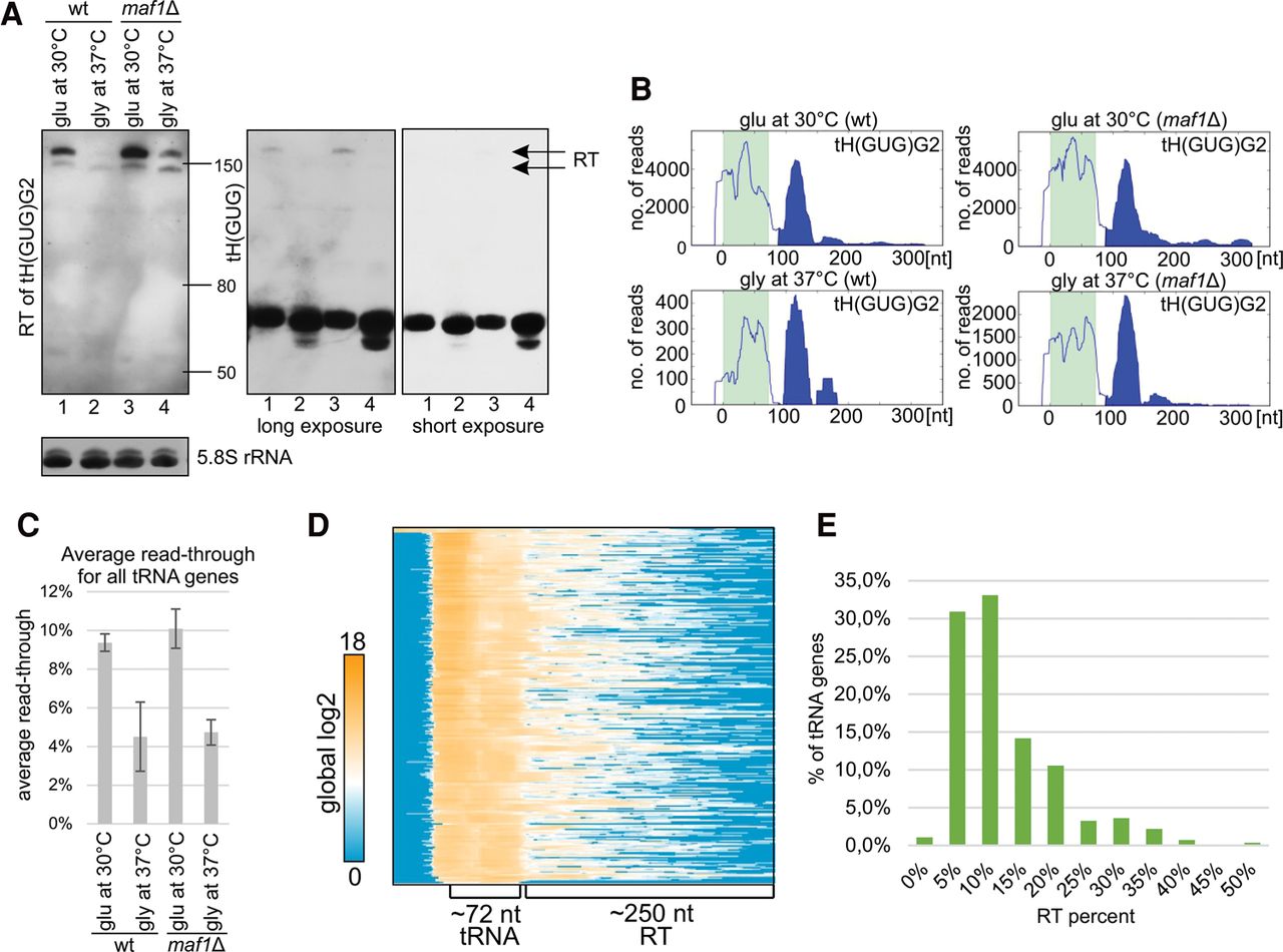 Transcription termination read-through (RT) by RNAPIII. (A) Northern blotting reveals extended transcripts from gene tH(GUG)G2 (left). Total RNA extracts were analyzed by Northern blotting using probes specific to the RT sequence 54 nt downstream from the tRNA (left), within tH(GUG) (right), and 5.8S rRNA (loading control). Extended forms are of low abundance relative to mature tH(GUG). (B) Distribution of read density over gene tH(GUG)G2 under conditions presented in A. These CRAC results are consistent with the Northern blot but indicate the instability of extended transcripts. (C) Average RT levels for all nuclear tRNA genes. RT was calculated for each gene under indicated conditions separately, and average RT values for all nuclear tRNA genes are presented. (D) Heatmap for all nuclear tRNA genes, with 50-nt 5′ flanks and 250-nt 3′ flanks, clustered using the 1-Pearson coefficient. Hits intensity is presented as log2 of global values. Regions of mature tRNA genes and RT are labeled. (E) Histogram showing distribution of RT among all tRNA genes.