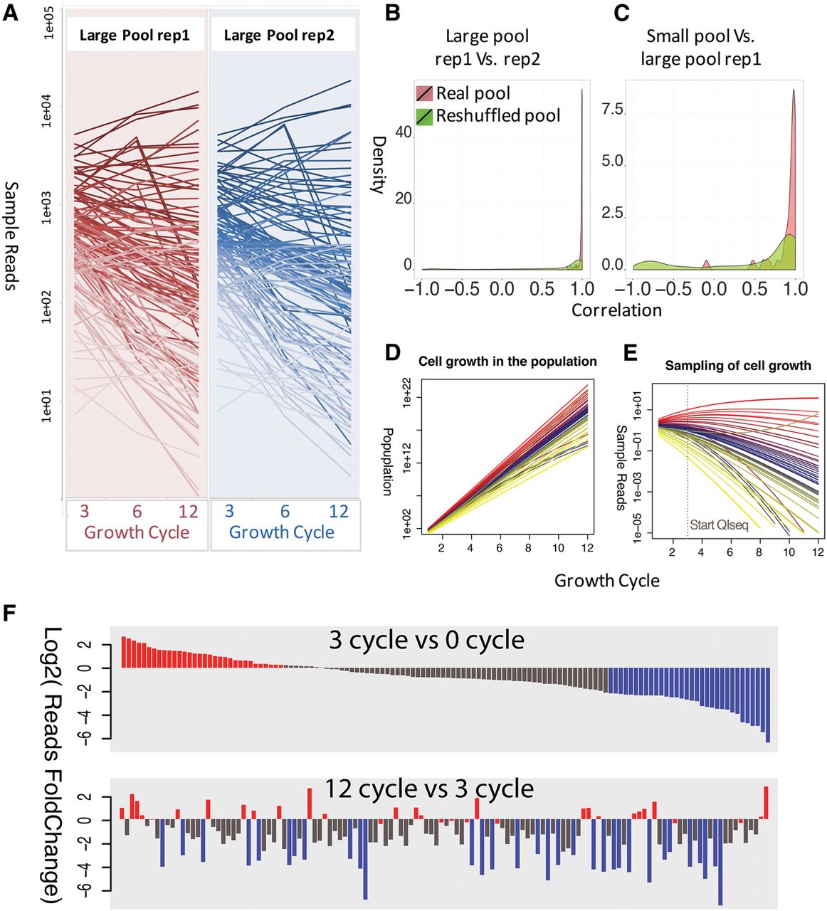 Using QIseq to measure growth of 128 piggyBac mutants in a single pool. (A) Growth of each mutant within two biological replicates (rep1, rep2) of the same pool, grown over 12 cycles. (B) Permutation-based statistical test of reproducibility between replicates and between different screens. (C) The same mutants in different replications always had a significantly higher correlation compared with randomly reshuffled mutant pairs (Wilcoxon test P < 1 × 10−5). (D) Estimates of population growth by individual piggyBac mutants within the pool of clones grown together over 24 cycles. (E) Estimates of QIseq sampling of piggyBac mutant populations. While all piggyBac mutants continue to proliferate, the relative abundance of most slower growing mutants is predicted to decrease (“bottom quartile”) relative to the few faster growing parasites (“top quartile”). (F) Classification of phenotypes from the large pool of 128 mutants identified neutral or advantageous mutations (red; top quartile of growth, N = 32) and deleterious mutations (blue; bottom quartile).