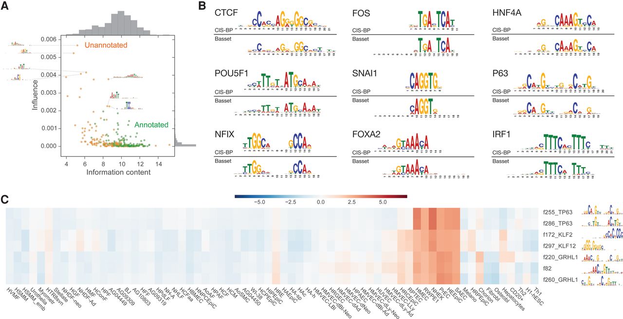 Basset initial convolutional layer discovers known and novel sequence motifs. (A) In the scatter plot, the x-axis describes the information content for the PWMs represented by the 300 first layer convolution filters (Methods). The y-axis describes an influence score, which we compute by setting all output from the filter to its mean (thus nullifying the filter) and taking the sum of squares of the vector of accessibility prediction changes over all cells. We colored filters by whether or not they could be annotated at a q-value threshold of 0.1 by the TomTom motif comparison tool to known TF motifs in the human CIS-BP database. (B) Overall, 45% of filters could be annotated, including the alignments shown here. (C) Clustering the filters by their influence on accessibility predictions in each cell type revealed this set matching TP63, GRHL1, and KLF factors, which are known to be involved in epithelial development.