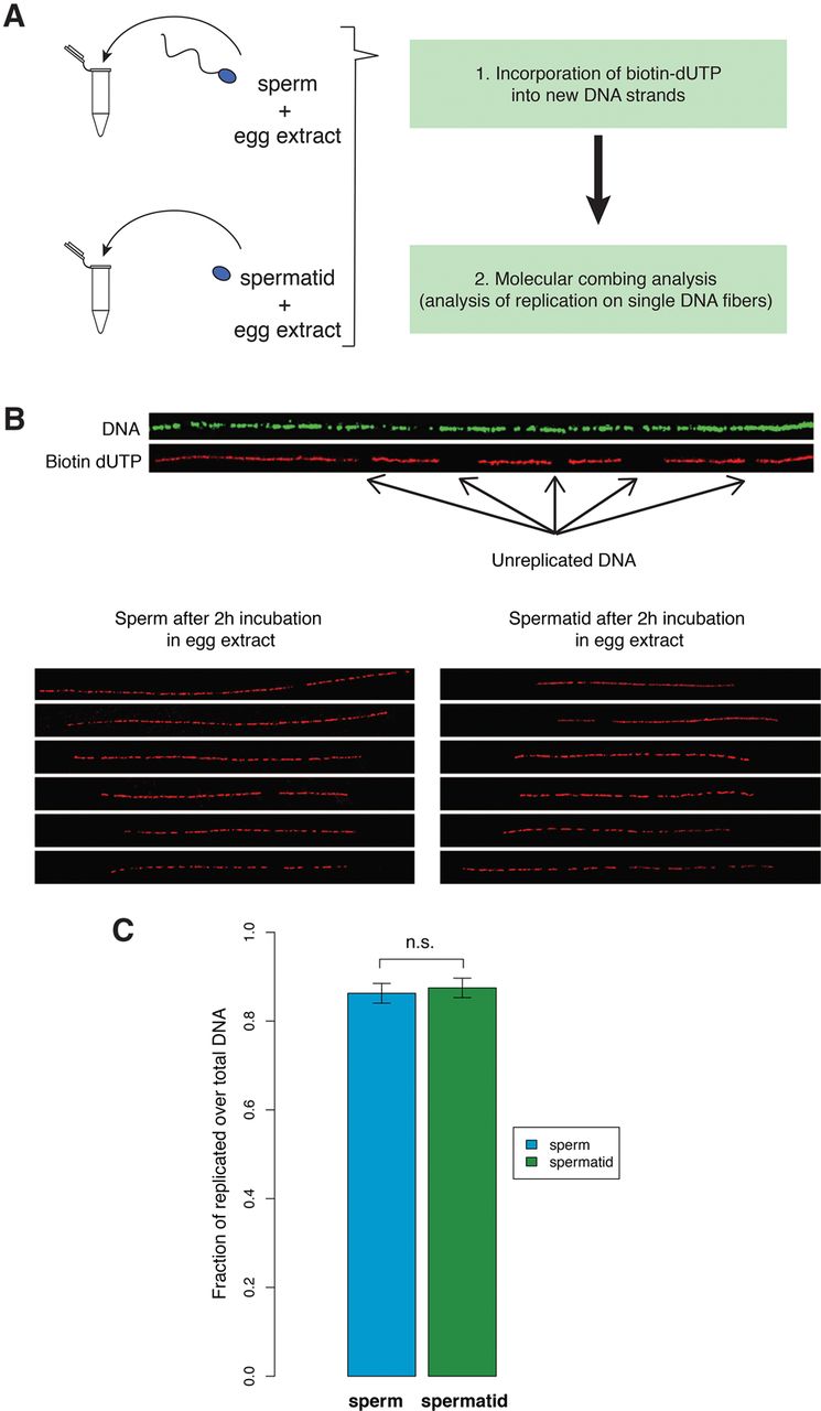 Spermatids are as good as sperm at DNA replication. (A) Sperm and spermatids are separately incubated with egg extracts supplemented with biotin-dUTP. Subsequently, DNA fibers are isolated and subjected to molecular combing, which reveals replication on single DNA fibers. (B) Examples of DNA fibers after immunostaining procedure. Antibody staining against DNA reveals the total length of the fiber (green) and antibody staining against biotin reveals the replicated DNA (red). The bottom panels show representative examples of replication staining from sperm and from spermatids incubated in egg extracts. (C) Replication extent measured as the proportion of DNA that incorporated biotin-dUTP to the total fiber length. Results are from at least 125 independent DNA fibers (22,000 kb of DNA for each sample). Error bars: SEM. Samples were not significantly different (P-value = 0.41, KS-test).