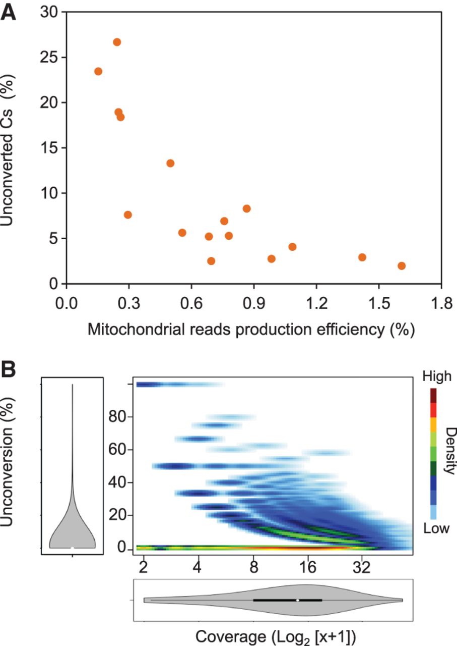Mitochondrial DNA methylation estimates vary with the mitochondrial reads' production efficiency. Data from different genome-wide bisulfite sequencing experiments were analyzed. (A) Scatter plot representation of the percentage of unconverted cytosines (Cs) within mitochondrial reads versus the mitochondrial read production efficiency in wild-type plants. The production efficiencies were calculated as the number of mitochondrial reads divided by the total number of mapped reads. They are expressed as percentages. (B) Density plot representation of unconversion versus coverage for all the mitochondrial cytosines analyzed in experiment SRR578938 (Zemach et al. 2013). The distribution of unconversion and coverage is represented in both axes.