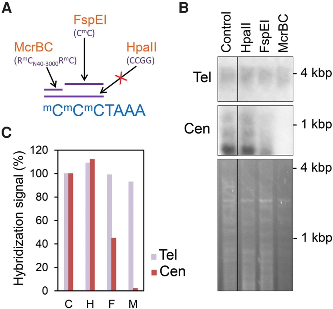 Methylation-dependent restriction enzyme analyses confirm the absence of telomeric DNA methylation. (A) Cartoon representing the sequence specificity of the restriction enzymes used to digest Arabidopsis genomic DNA. (B) Southern blot hybridizations of Arabidopsis genomic DNA digested with the restriction enzymes indicated in A. The upper panel shows equal amounts of undigested (Control) or digested (HpaII, FspEI, or McrBC) DNA samples hybridized with a telomeric probe. The four DNA samples were also digested with Tru9I prior to hybridization. The middle panel shows the hybridization of the same samples with a 180-bp centromeric repeat probe. The ethidium bromide staining of the samples is shown in the lower panel. The control DNA sample was run in the same gel as the rest of the samples, so that their corresponding hybridization signals were processed equally. (C) Bar plot representation of the telomeric and centromeric bottom band hybridization signals expressed as percentages of the control. C, H, F, and M represent Control, HpaII, FspEI, and McrBC, respectively.