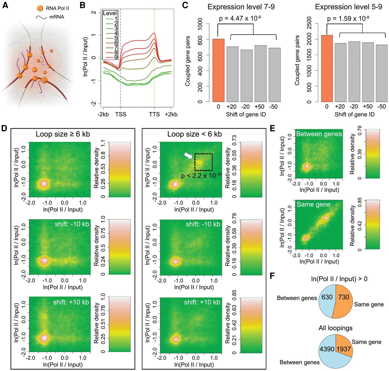Coupling of expressed genes. (A) A cartoon of the transcription factory model. (B) Correlation between RNA Pol II binding and gene expression levels. Genes are scaled to align their TSSs and TTSs. (C) Coupled gene pairs that are actively expressed. The background (gray) was estimated by reassigning new expression levels to genes according to the values from the 20th or 50th genes upstream or downstream. Loops shorter than 6 kb were not considered. P-values indicate significance relative to the permutation-based null distribution of background. (D,E) Association of RNA Pol II with chromatin loops. The lower two plots in D always show controls where the coordinates of RNA Pol II signals (measured as the natural base logarithm of the ratio between normalized Pol II and input coverage) were shifted 10 kb up- or downstream. The P-value comes from testing for enrichment of loops in the highlighted square relative to a permutation-based null distribution of background, estimated by shifting Pol II signal coordinates ±10 kb and ±20 kb. The two panels in E only include loops shorter than 6 kb. See Figure 2C legend for more information. (F) Interactions between and within genes that are connected by chromatin loops with interacting partners that overlap gene bodies. The numbers indicate pairs of genes in each category. In both comparisons, only loops shorter than 6 kb were considered, and for RNA Pol II on top, only loops where both interacting partners were enriched for Pol II (having a signal/input ratio larger than 1) were selected.