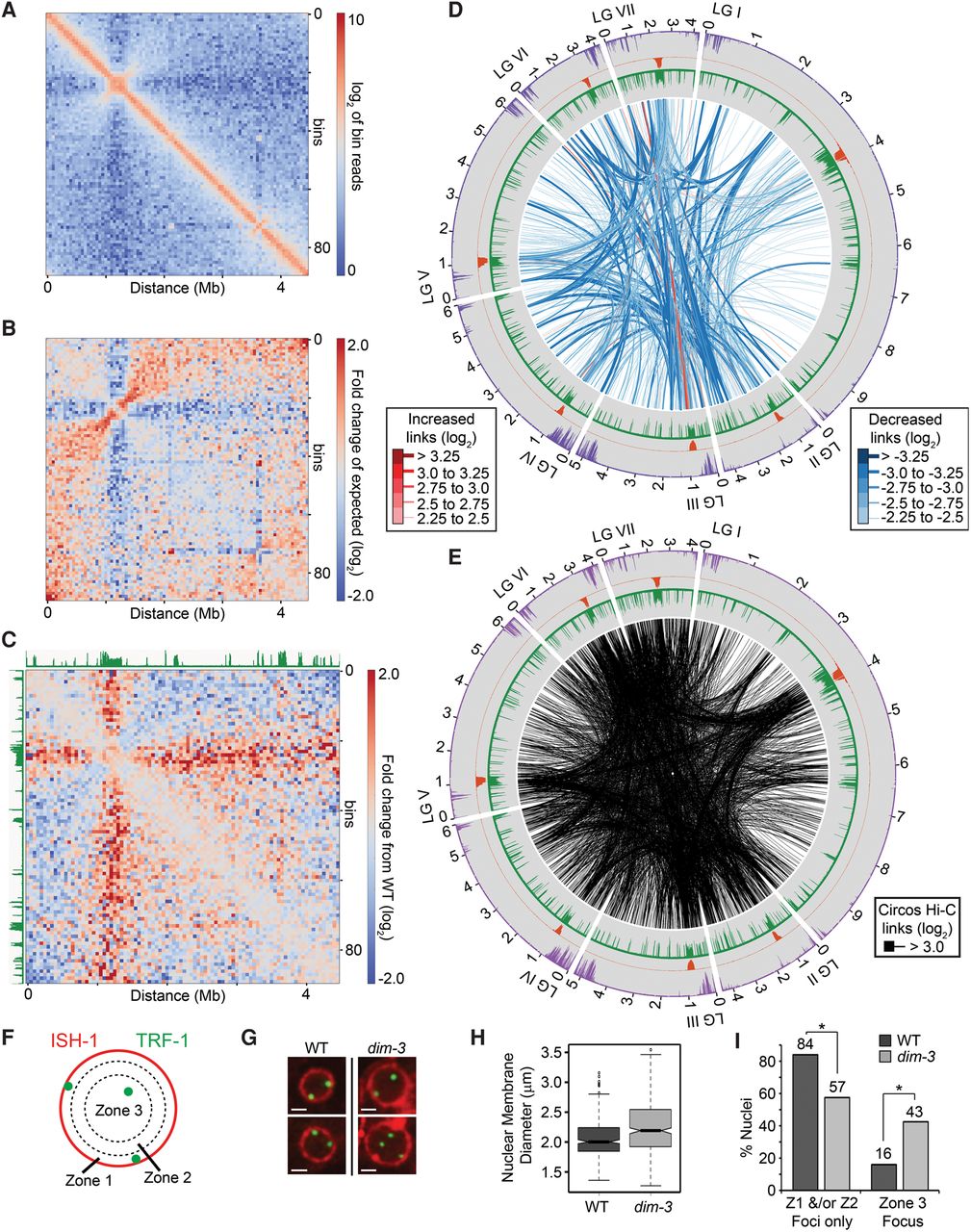 Defective importin alpha (DIM-3) causes altered chromatin conformation. (A) Heatmap of observed contacts (log2) within LGII in dim-3 at 50-kb resolution. (B) Heatmap of LGII showing the ratio (log2) between the observed frequency of interaction and the median frequency at each genomic position in the dim-3 strain. (C) Heatmap showing the fold change in observed versus expected contact frequencies (log2) of LGII between the dim-3 and WT strains. WT levels of H3K9me3 are displayed in green. (D) Circos plot of the largest changes in inter-chromosomal interaction frequencies in dim-3 and WT strains. To normalize data set depths, 16.5 million read pairs were randomly selected from the WT data set and compared to the entire dim-3 data set. Regions with increased interaction frequencies are in red, whereas regions with decreased frequencies are in blue; different line thicknesses were used to convey differences in the absolute magnitude of the changes. Although WT H3K9me3 (green), CenH3 (orange), and H3K27me2/3 (purple) histograms are shown, a dim-3 strain has a large reduction of H3K9me3 (Klocko et al. 2015). (E) Circos plot displaying all strong (log2 > 3.0) inter-chromosomal chromatin interactions after normalizing for genomic distance within the dim-3 strain, as in Figure 1D. (F) Schematic depicting the division of the nuclear space into three zones (1–3) of equal area for the categorization of telomeric foci (green; TRF-1-GFP) relative to the nuclear membrane (red; ISH-1-BFP). (G) Two examples of nuclei from WT (left) and dim-3 (right) strains expressing TRF-1-GFP foci and ISH-1-BFP. Each scale bar is 1 µm. (H) Box plot showing nuclear membrane diameter (μm) of WT (dark gray; n = 324 nuclei) and dim-3 (light gray; n = 366 nuclei) strains. Mean and variance of nuclear membrane diameter for WT is 2.05 μm ± 0.1 and 2.25 μm ±0 20 for dim-3; P = 5.6 × 10−11 (ANOVA test). (I) Graph showing the percentage of WT (dark gray; n = 324 total nuclei) or dim-3 (light gray; n = 366 total nuclei) nuclei with telomeric foci in only Zone 1 or Zone 2 (left) or containing at least one Zone 3 telomeric focus (right). Note that since dim-3 nuclei often contained multiple foci in Zone 3, this tally may underestimate the total number of decoupled telomeres. Asterisks denote significant changes (P < 0.01; nuclei with foci in Zone 1 and/or Zone 2 only P-value = 3.7 × 10−5; nuclei with foci in Zone 3 P-value = 3.9 × 10−10; χ2 test); P-value = 6.7 × 10−14 (χ2 test) of all Zone differences between WT and dim-3.