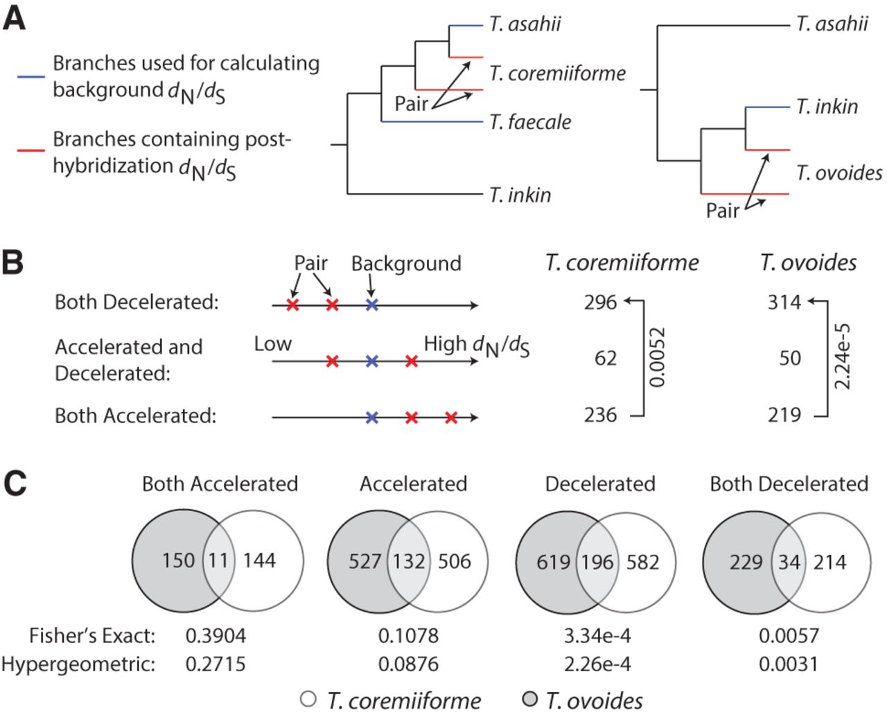 Deceleration of evolutionary rates following genome hybridization. (A) Diagram illustrating how background dN/dS are defined. Background dN/dS are calculated as the weighted average of dN/dS on the phylogenetic tree branches leading to nonpolyploid species (blue branches, weighted by branch dS). dN/dS ratios are then calculated as the ratio of dN/dS of the branches leading to hybrid species (red branches) over the background dN/dS. (B) The number of homeologous gene pairs with varying patterns of acceleration or deceleration in evolutionary rates. The threshold for calling genes as evolutionarily accelerated or decelerated is ±twofold in dN/dS ratio. Arrows and labels indicate the directions of enrichment and the binomial test P-values (under the null hypothesis that a gene pair is equally likely to become evolutionarily accelerated or decelerated). (C) Overlap of evolutionarily accelerated and decelerated homeologous gene pairs between the two hybridization events. The “accelerated” group consists of accelerated/accelerated and accelerated/neutral pairs. The “decelerated” group consists of decelerated/decelerated and decelerated/neutral pairs. The number of gene pairs in each species and the overlap size are shown. Fisher's exact test and hypergeometric test P-values are indicated below each comparison.