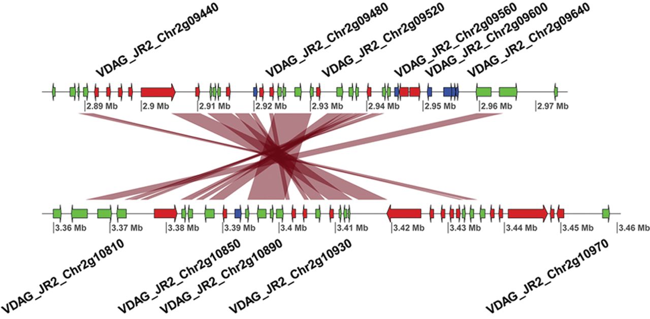 Example of gene losses after segmental duplications within the V. dahliae strain JR2 genome. Example of a segmental duplication between LS regions located on Chromosome 2. Red ribbons indicate regions of homology between the two loci. Blue arrows indicate gene models present only at one of the two loci, whereas green and red arrows indicate common genes and transposable elements, respectively.