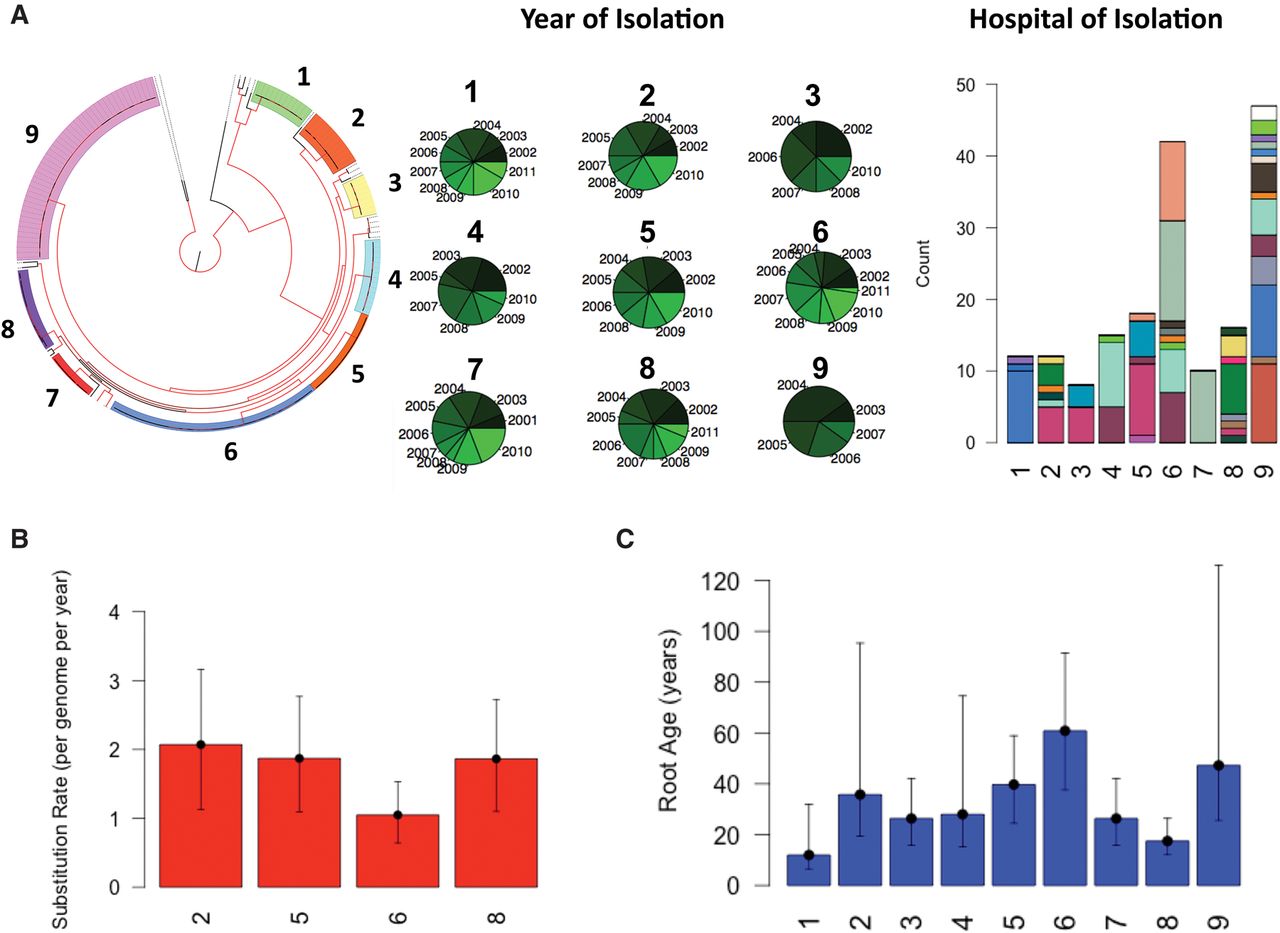 Temporal, geographical and phylogenetic clustering of isolates on the tree. (A) Phylogenetic tree with isolates colored according to cluster. The nodes with bootstrap support >90 are shown in red. The pie charts show the distribution of years of isolation and the color intensity corresponds to the temporal order, namely, the older the year of isolation the darker the color. The stacked bar plot shows the distribution of hospitals across the major clades on the phylogenetic tree. Each color corresponds to one hospital. (B) The estimated substitution rate for the clusters with significant temporal signal. Error bars show the 95% confidence intervals. The mutation rate is obtained by taking the average of three independent BEAST runs. (C) The estimated age of the MRCA for each cluster. Error bars correspond to 95% confidence interval for clusters shown in B. For the clusters without significant temporal signals, i.e., clusters 1, 3, 4, 7, and 9, we calculated the mean root age by using the mean substitution rate for clusters 2, 5, 6, and 8. For error bars, we considered the substitution rates obtained for maximum and minimum of 95% confidence intervals for clusters 2, 5, 6, and 8.
