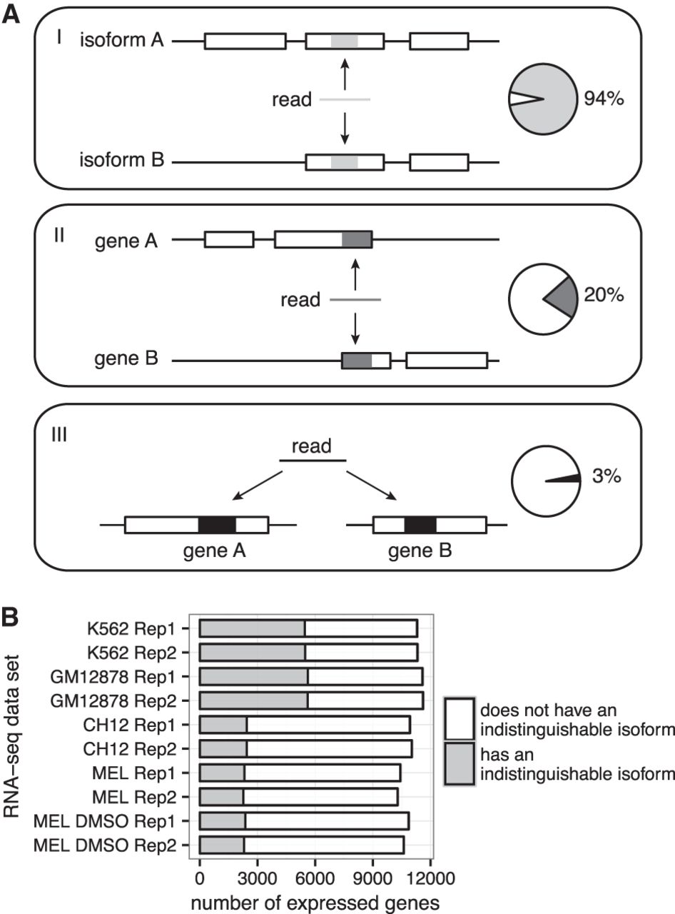 Multimapping reads are prevalent in human and mouse RNA-seq data. (A) Three classes of multimapping reads and the percentages of expressed genes (TPM ≥ 1) to which each class maps in the K562 replicate one data set. (B) Number of expressed genes that have indistinguishable isoforms. An indistinguishable isoform is one for which all potential RNA-seq fragments derived from it can align to other isoforms (for the calculations of distinguishability, see section I.B in the Supplemental Material). An expressed gene is required to have abundance of one TPM or more. Data are from the two RNA-seq replicates (“Rep1” and “Rep2”) of each of the human cell lines K562 and GM12878 and the mouse cell lines CH12, MEL, and MEL DMSO.