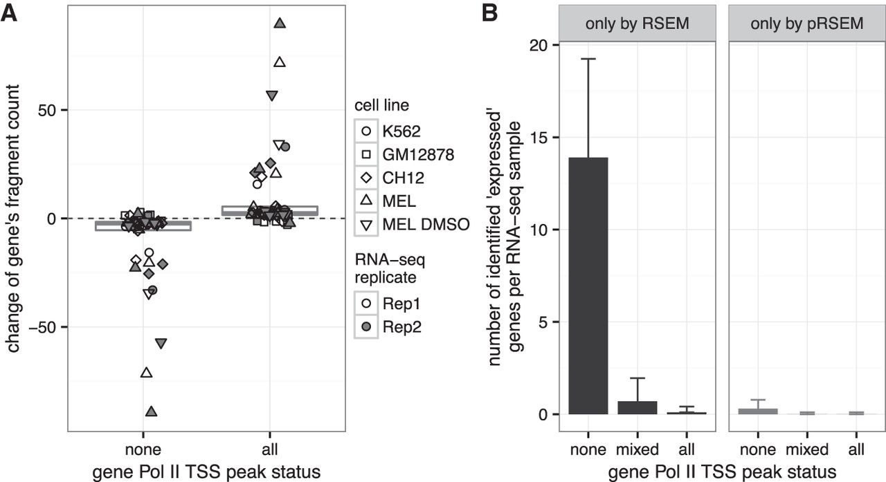 pRSEM more accurately allocates multimapping reads between genes. (A) Changes of estimated fragment counts between pRSEM and RSEM for pairs of genes overlapping with each other and sharing reads exclusively. Genes that had a fragment count change of less than one were excluded. (B) The numbers of genes for which RSEM (black) and pRSEM (gray) disagreed on expression status. Genes considered were those sharing RNA-seq reads with others but not overlapping with any other genes. The numbers were calculated from 10 RNA-seq replicates from five human and mouse cell lines. Error bars represent one standard deviation.