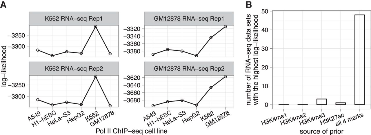 Informative priors for pRSEM can be derived from a broad range of data types. (A) Comparison of training set log-likelihoods based on isoforms partitioned by Pol II ChIP-seq peaks from six human cell lines. Log-likelihoods were computed by fitting pRSEM's Dirichlet-multinomial model to RNA-seq fragment counts of the partitioned training set isoforms. (B) Comparison of five sources of prior information by their effectiveness on 52 RNA-seq data sets of mouse hematopoietic cells. For each RNA-seq data set, all five sources were separately applied to fit the training set and the goodness of fit was assessed via the log-likelihood. The source resulting in the largest log-likelihood was considered to be the most effective. “All 4 marks” denotes a pRSEM partition model utilizing all four types of histone modification signals.