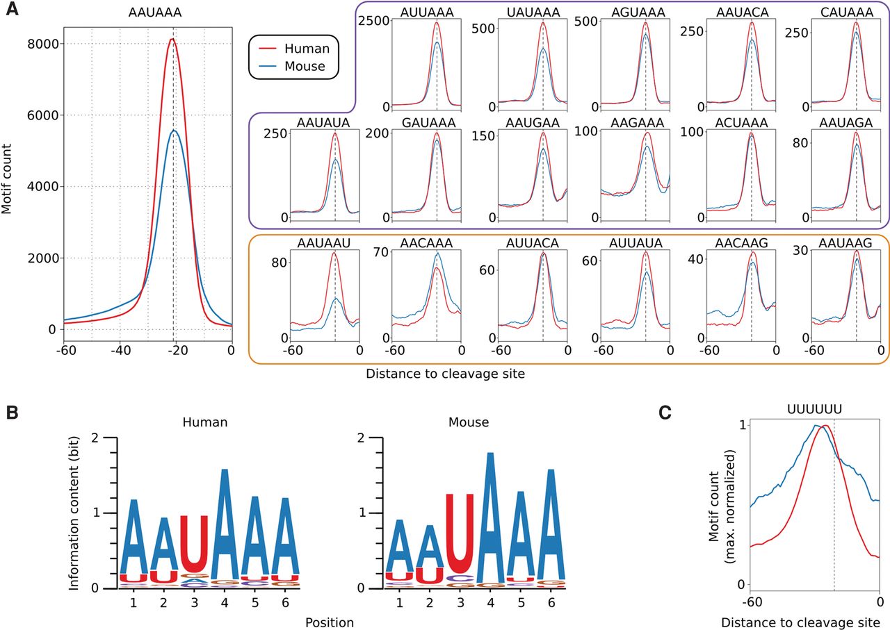 Hexamers with highly specific positioning upstream of human and mouse pre-mRNA 3′ end cleavage sites. (A) The frequency profiles of the 18 hexamers that showed the positional preference expected for poly(A) signals in both human and mouse. The known poly(A) signal, AAUAAA, had the highest frequency of occurrence (left). Apart from the 12 signals previously identified (AAUAAA and motifs with the purple frame) (Beaudoing et al. 2000), we have identified six additional motifs (orange frame) whose positional preference with respect to poly(A) sites suggests that they function as poly(A) signals and are conserved between human and mouse. (B) Sequence logos based on all occurrences of the entire set of poly(A) signals from the human (left) and mouse (right) atlas. (C) The (U)6 motif, which is also enriched upstream of pre-mRNA cleavage sites, has a broader frequency profile and peaks upstream of the poly(A) signals, which are precisely positioned 20–22 nt upstream of the pre-mRNA cleavage sites (indicated by the dashed, vertical line).