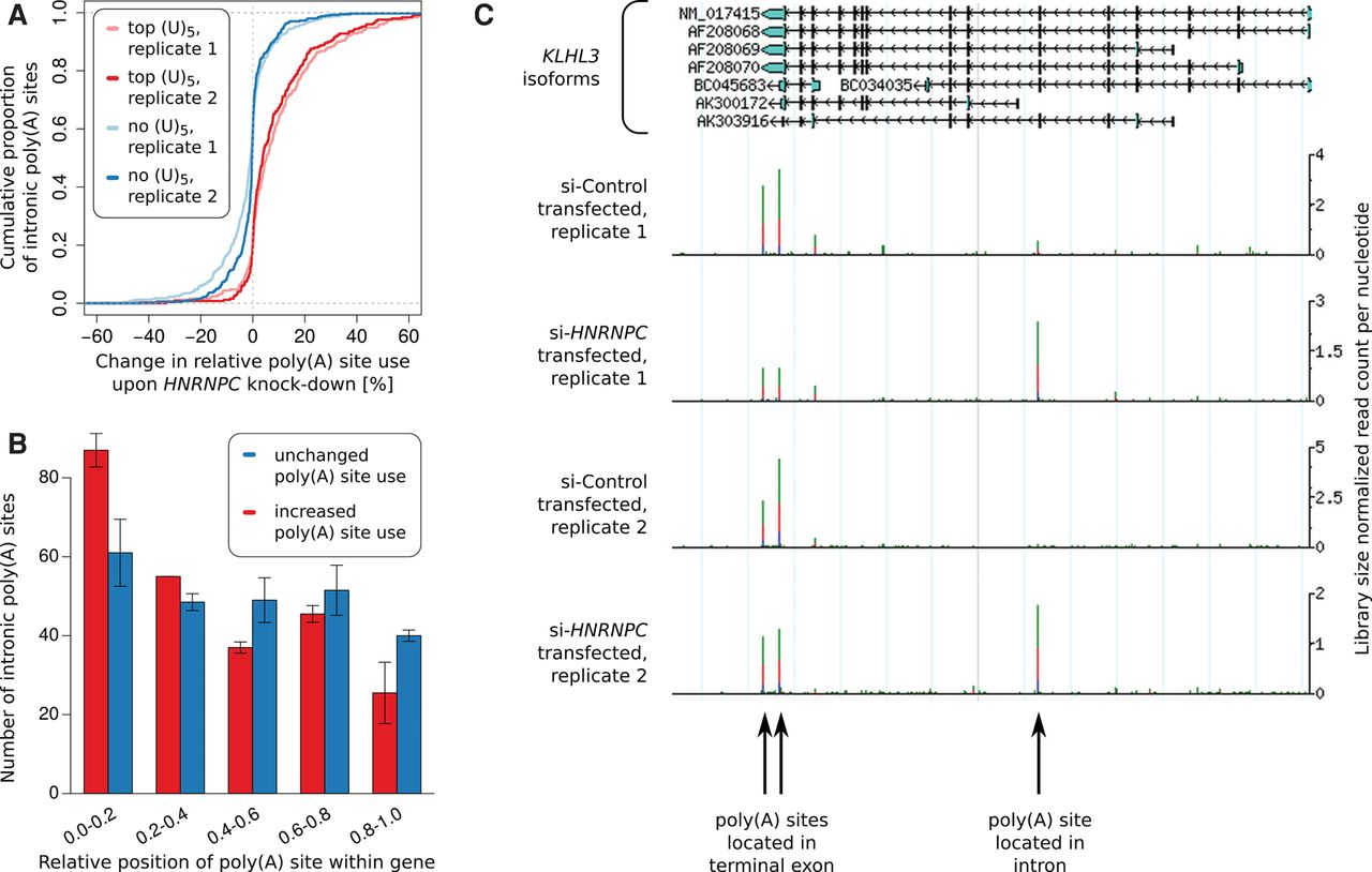 HNRNPC knock-down leads to increased usage of intronic poly(A) sites. (A) The change in the relative use of intronic poly(A) sites that did not contain any (U)5 within ±200 nt and of the top 250 intronic poly(A) sites according to the number of (U)5 motifs within ±50 nt around the cleavage site, upon HNRNPC knock-down. (B) Relative location within the gene of the top 250 most-derepressed intronic poly(A) sites that have HNRNPC binding motifs within −200 to +100 nt around their cleavage site and of the 250 intronic poly(A) sites that changed least upon HNRNPC knock-down. (C) Screenshot of the KLHL3 gene, in which intronic cleavage and polyadenylation was strongly increased upon HNRNPC knock-down.